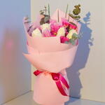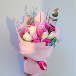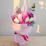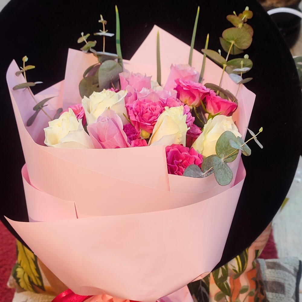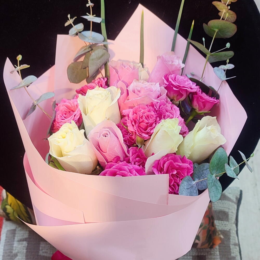 Pink rose - 3 adet okaliptüs - 3 adet white roses - 4 adet çardak gül pembe - 3 adet