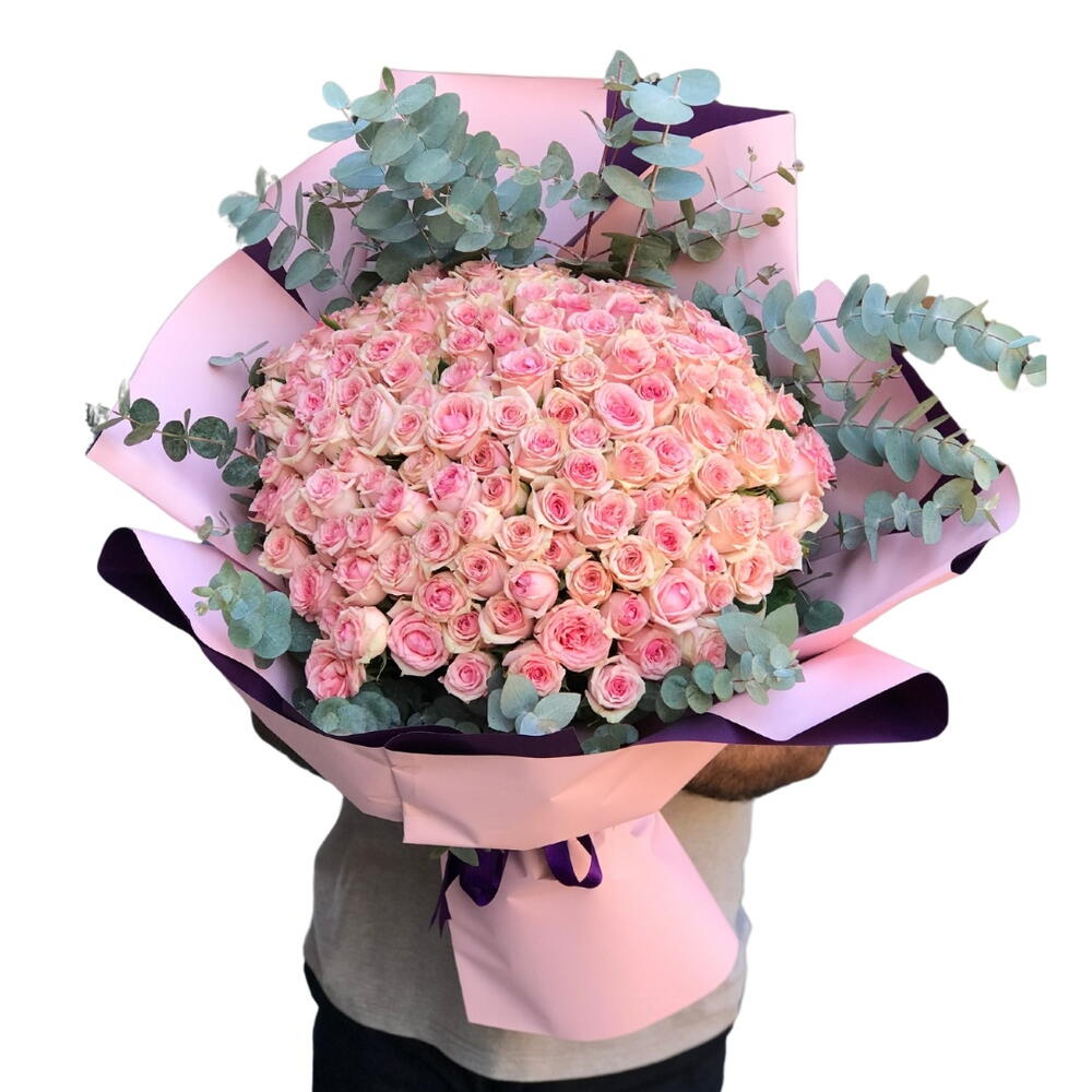 Bu muhteşem çiçek buketi, 101 adet canlı renkte güller ve 10 adet ferah kokulu okaliptüs yapraklarından oluşmaktadır. Sevdiklerinizi şaşırtmanın ve tüm özel anlarınızı unutulmaz kılmanın mükemmel bir yolu. Bir ömür boyu süretcek anılar oluşturmak için bu benzersiz buket ile kalpleri fethedin.
