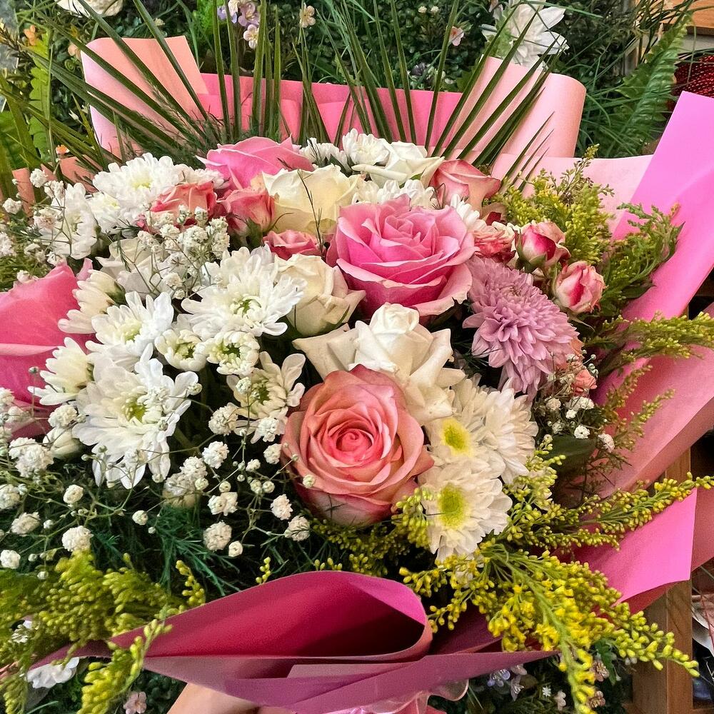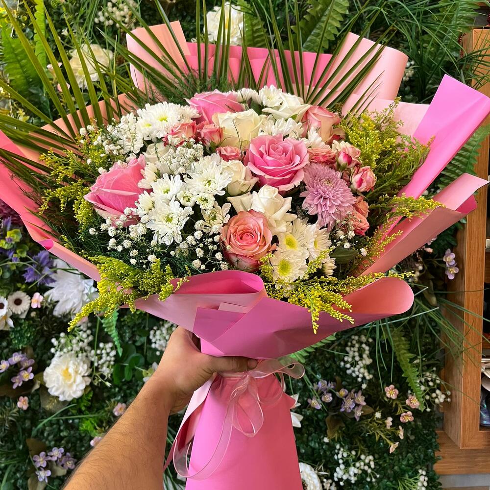 Bu zarif Karışık Buket, romantizmi ve sevgiyi sembolize eden 7 adet pembe gül, neşe ve masumiyeti temsil eden 10 adet papatya, saflığı ve saygıyı yansıtan 3 adet beyaz gül ile tasarlanmıştır. Ayrıca buketi tamamlayan ve göz alıcı bir estetik katan 4 adet fenix yaprak, 5 adet çekici çardak gül ve 5 adet dayanıklı solidas içerir. Bu çarpıcı buket, sevdiklerinize olan düşünceli ve özel hislerinizi ifade etmenin mükemmel yoludur.