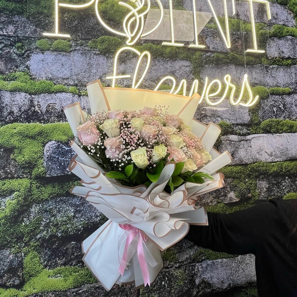 pembe gül - 15 adet beyaz gül - 10 adet pembe cipso - 10 adet