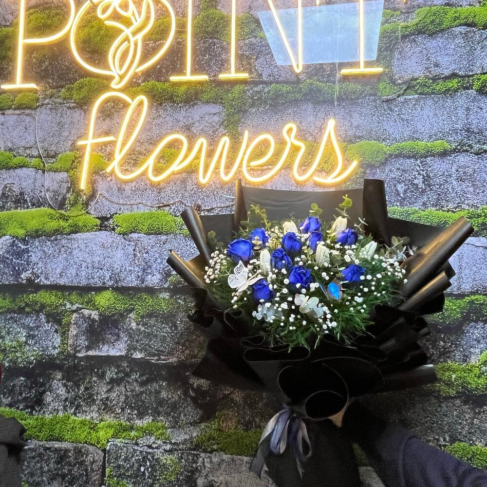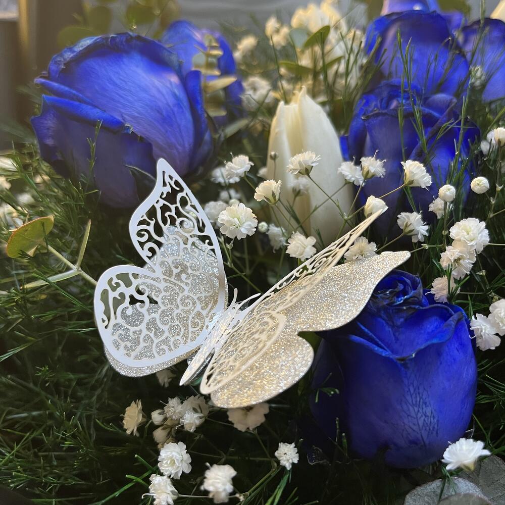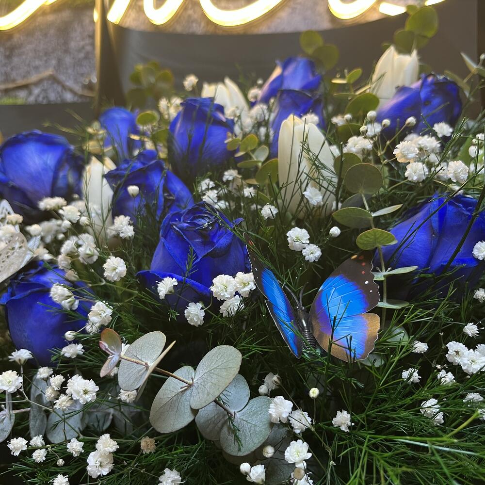 Bu özel Karışık Buket, dikkatlice seçilmiş ve birleştirilmiş çeşitli renk ve dokularıyla göz alıcıdır. Buketten ışıldayan 2 adet kurdele, 20 adet taze virgatus, 7 adet nefis okaliptus, 10 adet masum beyaz lale, 10 adet büyüleyici mavi gül ve 15 adet cipsodan oluşmaktadır. Siyah buket kağıdı ile şık bir şekilde paketlenmiş ve 7 adet kelebek detayı ile son rötuşlar yapılmıştır. Biraz doğa, biraz şıklık ve bolca zarafet barındıran bu buket, sevdiklerinize ne kadar değer verdiğinizi hissettirecek mükemmel bir hediye.
