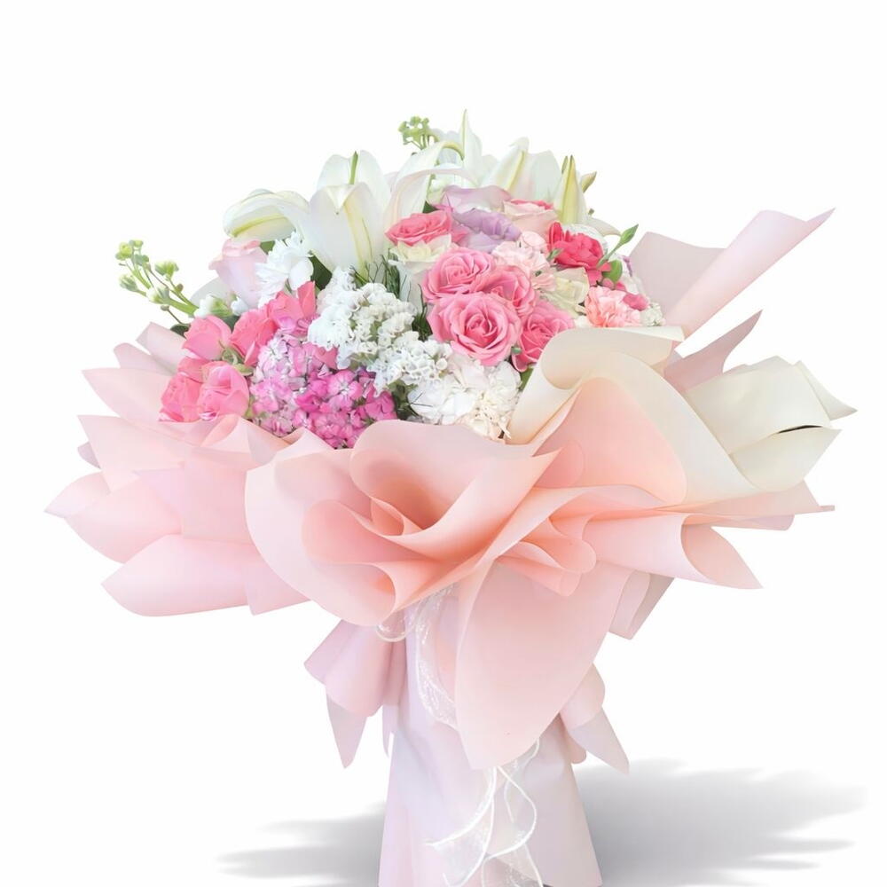 virgatus - 20 adet lilyum - 2 adet şebboy - 2 adet lila gül - 3 adet beyaz karanfil - 5 adet hüsnü yusuf - 3 adet pembe karanfil - 3 adet çardak pembe gül - 4 adet pembe ambalaj kağıdı - 5 adet beyaz status - 2 adet beyaz kalın kurdela - 1 adet