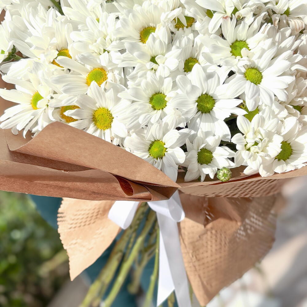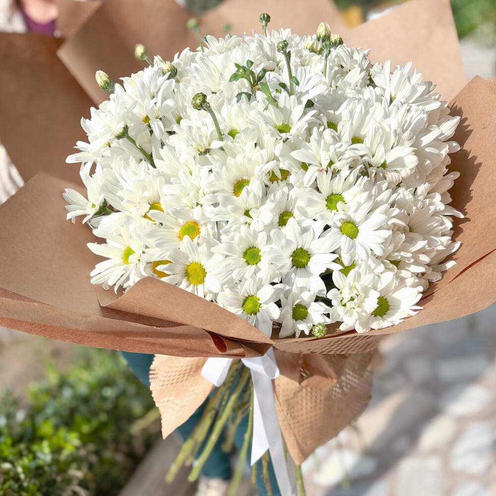 Premium Beyaz Papatya Buketi – Kraft Kağıtta Zarif ve Şık Aranjman