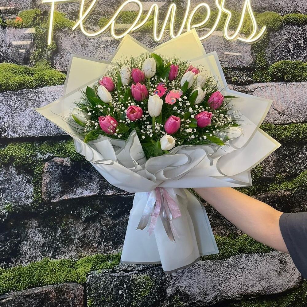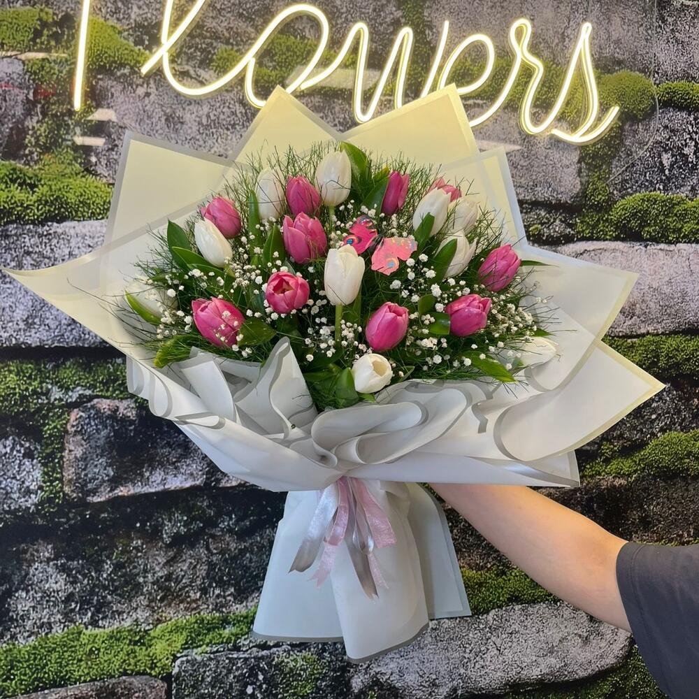 Zarif pembe ve beyaz tonlarda 20 adet laleden oluşan bu büyük boy buket, sade şıklığın en zarif halini yansıtır. Özenle hazırlanmış tasarımıyla zarafet, sevgi ve tazeliği bir araya getirir. Doğum günü, yıldönümü veya özel kutlamalarda sevdiklerinize baharın en güzel enerjisini hediye edin.