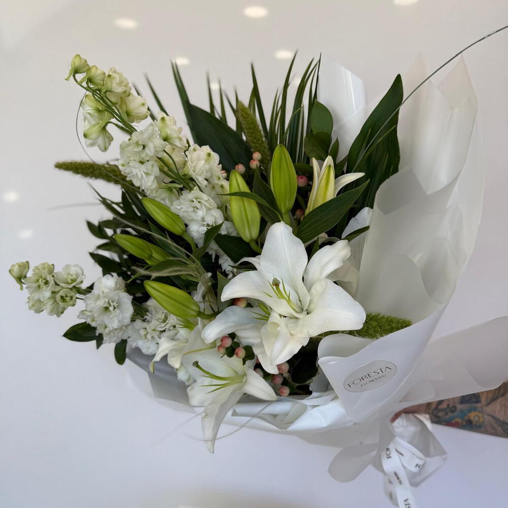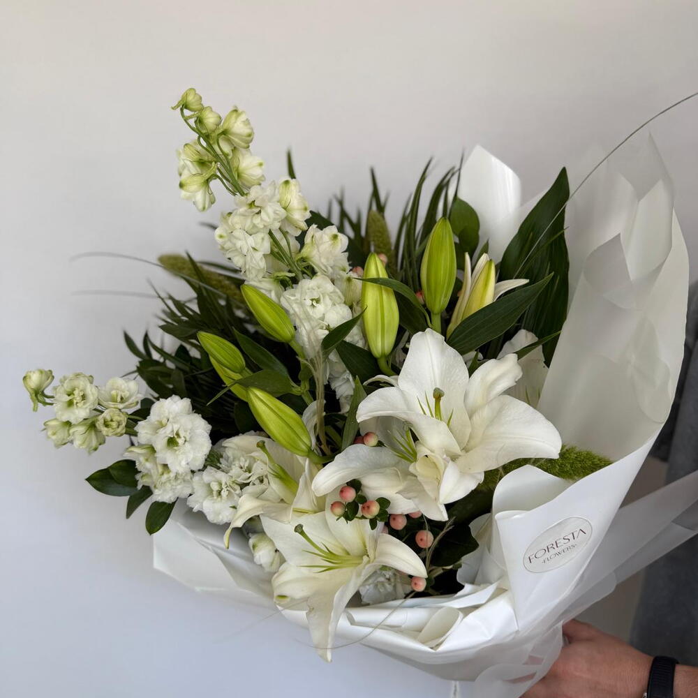 Bu zarif çiçek buketi, 2 adet lilyum, 2 adet delphinium, 2 adet fenix ve 2 adet aspidistra içerir. Her biri özenle seçilmiş ve mükemmel bir uyum yaratmak için bir araya getirilmiştir. Bu buket, herhangi bir olaya özel bir dokunuş katmak için mükemmeldir. Hem zarif hem de canlı olan bu çiçekler, sevdiklerinizin gününü aydınlatacaktır.