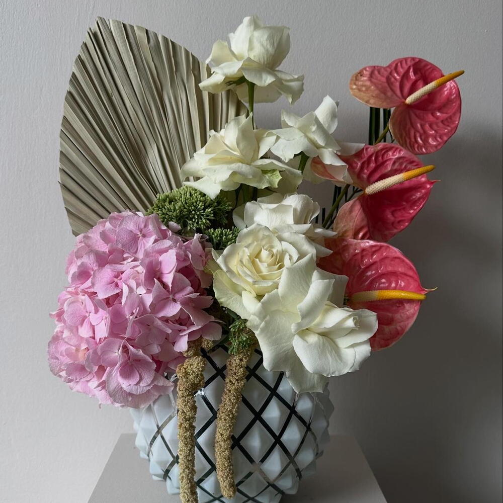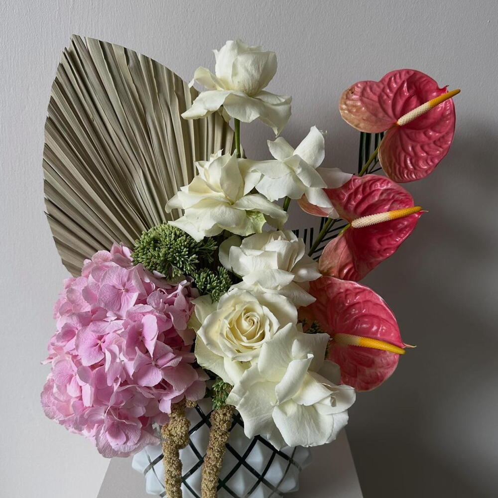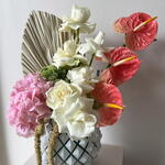 Bu zarif dekoratif çiçek aranjmanı, 1 adet büyüleyici ortanca, 6 adet şık gül ve 3 adet etkileyici antoriumdan oluşmaktadır. Bu çiçekler, yaşam alanınıza doğal bir dokunuş katmak için mükemmeldir. Ev veya ofis dekorasyonuna canlı ve taze bir atmosfer katacak bu çiçekler, aynı zamanda sevdiklerinize hediye etmek için de idealdir. Dayanıklılıkları ve kalitesi ile uzun süre keyfini çıkarabileceksiniz.