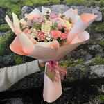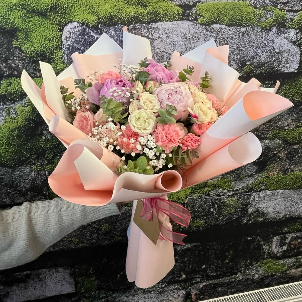 pembe gül - 4 adet okaliptus - 10 adet çardak gül - 5 adet pembe şakayık - 5 adet cipso - 10 adet pembe karanfil - 7 adet