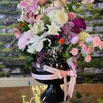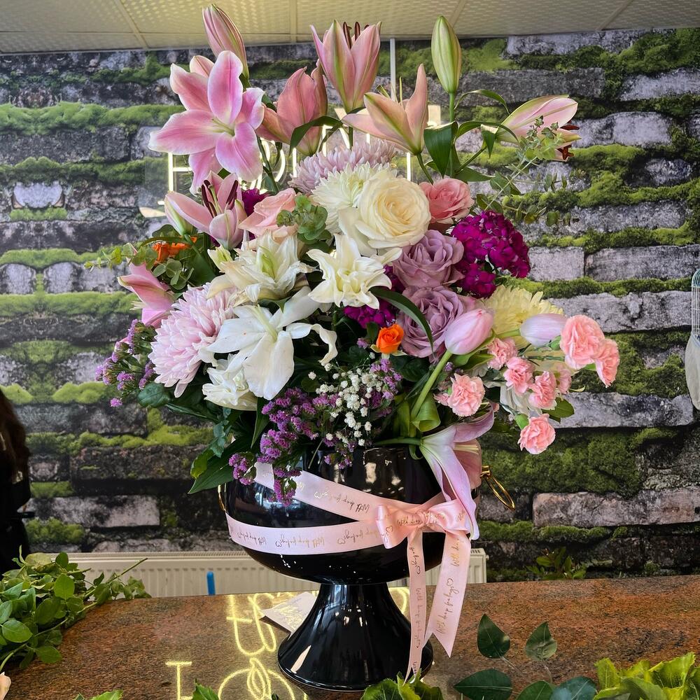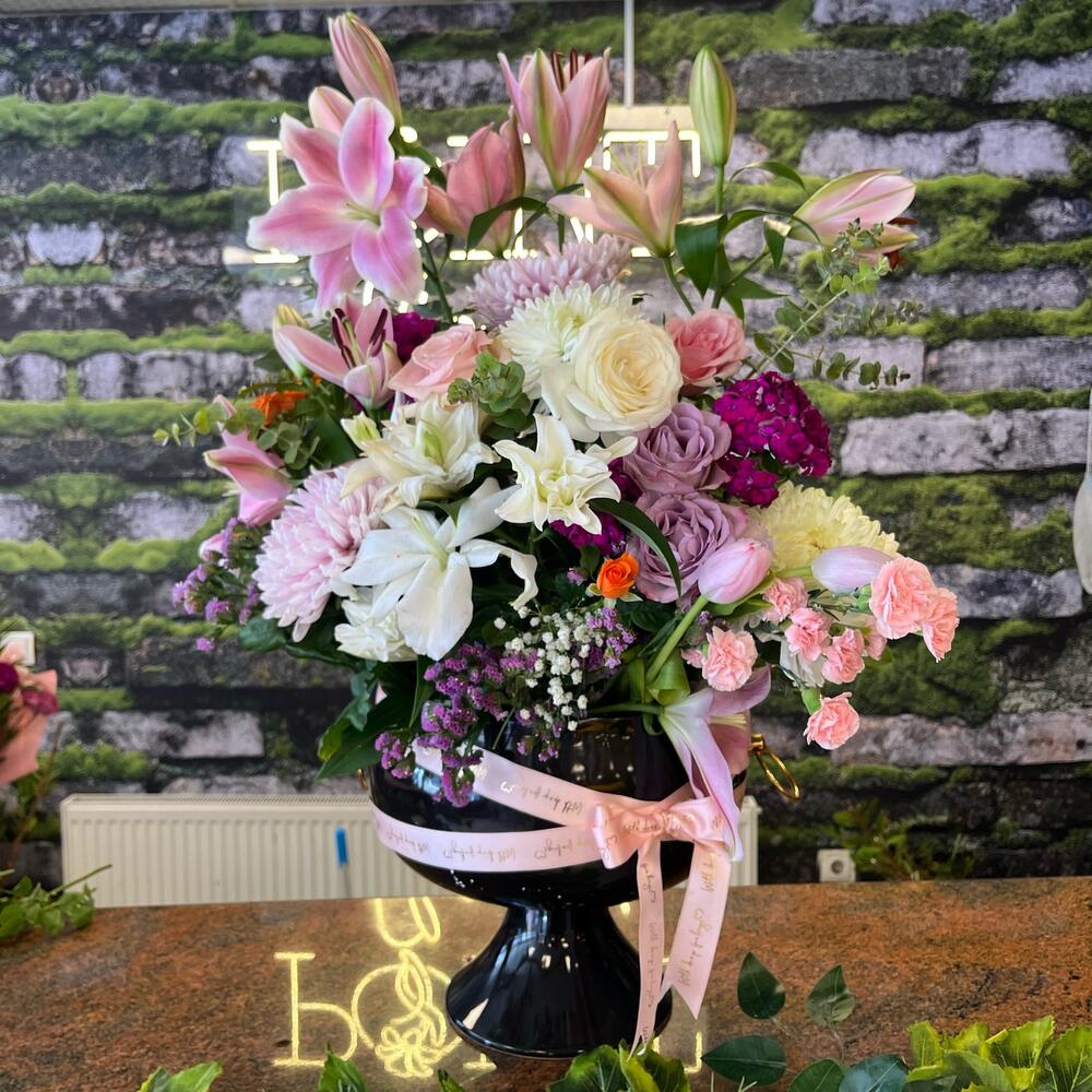 pembe lilyum - 3 adet anastasia - 5 adet pembe gül - 3 adet okaliptus - 15 adet lale - 2 adet status - 10 adet lila gül - 4 adet hüsnü yusuf - 8 adet pembe karanfil - 10 adet siyah porselen saksı - 1 adet