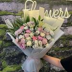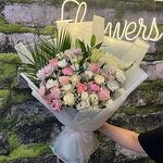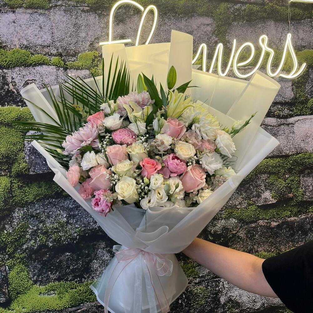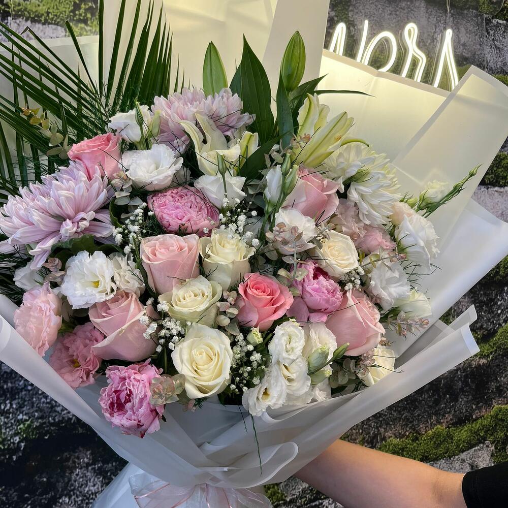 beyaz lisyantus - 10 adet lilyum - 2 adet pembe anastasia - 3 adet beyaz anastasia - 1 adet şakayık - 2 adet cipso - 10 adet pembe ithal gül - 10 adet fenix - 2 adet i̇thal beyaz gül - 10 adet