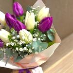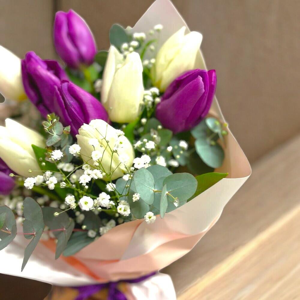 Mor ve beyaz lalelerle oluşturulan bu zarif buket, şıklığı ve zarafeti bir arada sunar. Minimalist tasarımıyla her türlü özel gün ve etkinlik için mükemmel bir hediye seçeneğidir. Lalenin zarafeti ile doğallığın uyumu bu bukette bir araya geliyor. Bakım Önerileri: Buketi serin bir ortamda muhafaza edin ve doğrudan güneş ışığından uzak tutun. Sapları düzenli olarak 1-2 cm keserek taze su dolu bir vazoya yerleştirin. Suyu 2-3 günde bir değiştirerek lalelerin ömrünü uzatabilirsiniz.