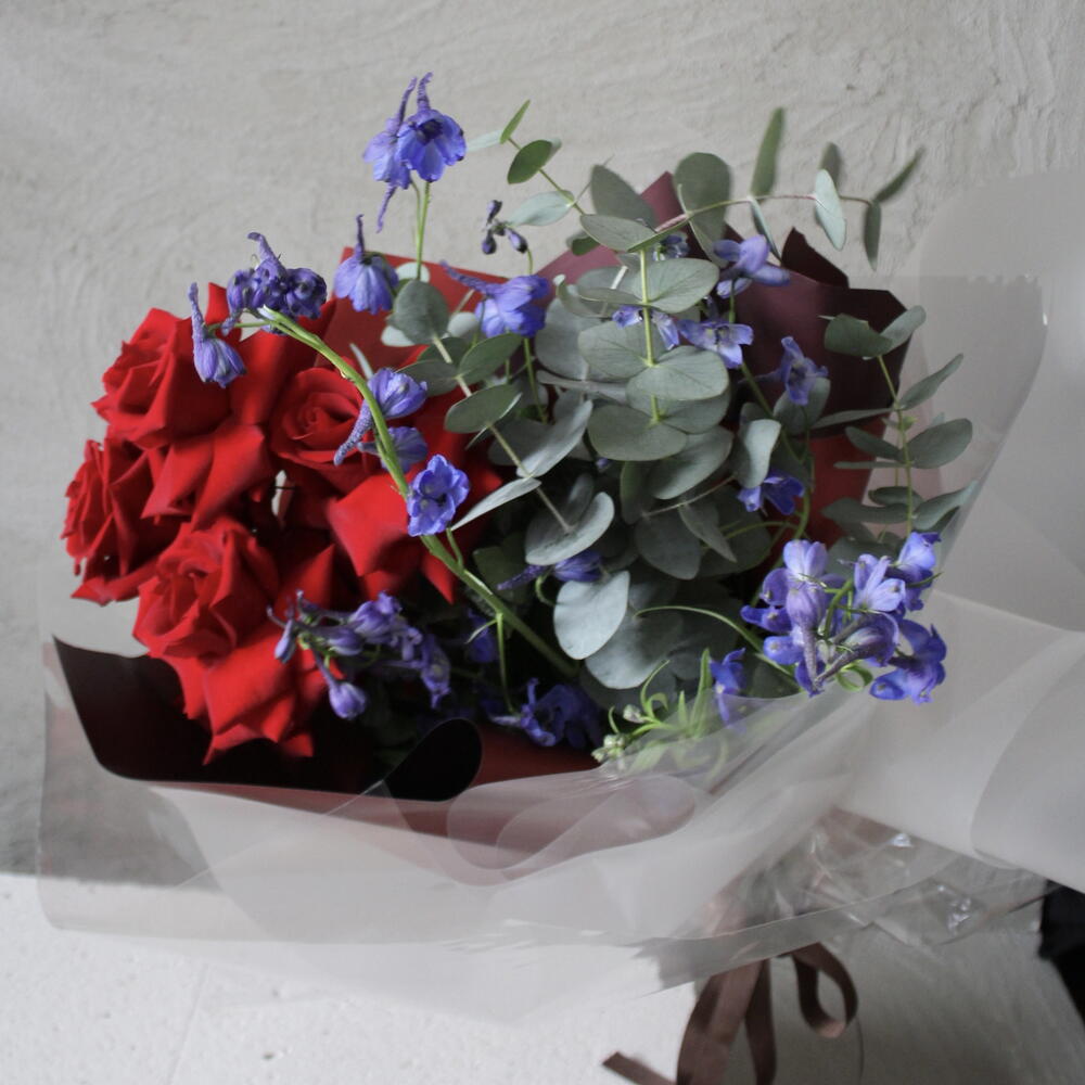 Bu özel çiçek buketi, 5 adet aşk ve tutkunun sembolü kırmızı gül, 6 adet zarif mavi delfinyum ve 2 adet taze okaliptus dalı ile zarifçe tasarlanmıştır. Hem romantik, hem de dingin bir hava yaratan bu çiçek buketi, sevdiklerinize olan duygularınızı en güzel şekilde ifade etmenizi sağlayacaktır. Görünümü ile büyüleyici bir etki bırakan bu ürün, büyüleyici kokusuyla da mekanlarınıza neşe katacaktır.