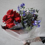 kırmızı gül - 5 adet okaliptus dal - 2 adet mavi delfinium - 6 adet