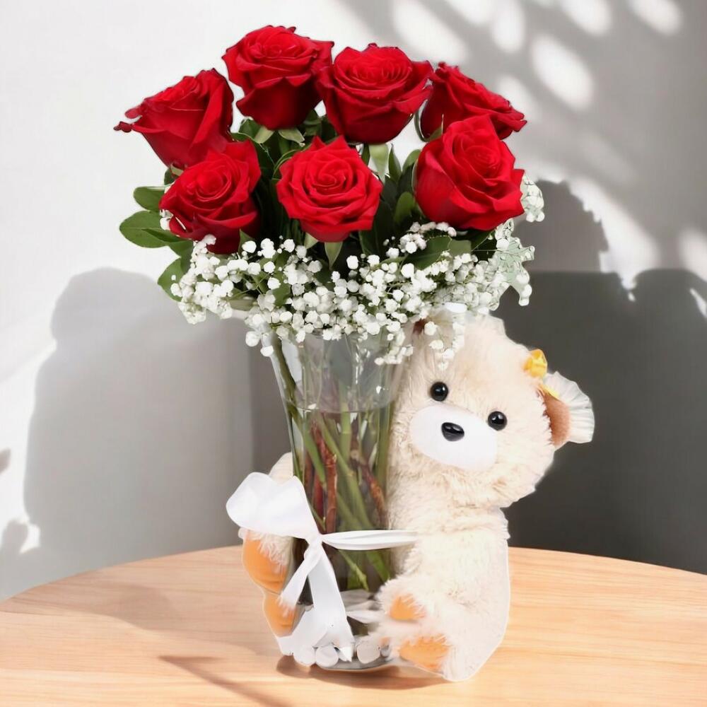 Bu zarif çiçek buketi, 1 adet kurdele, 1 adet vazo ve birbirinden güzel 7 adet 45 cmlik kırmızı gül ile süslenmiştir. Sevdiklerinizi özel hissettirecek bu buketin içerisinde ayrıca 1 adet sevimli peluş ayıcık ve 4 adet cypsophilia bulunmaktadır. Hem romantik hem de sıcak bir hediye arayanlar için ideal bir seçim.