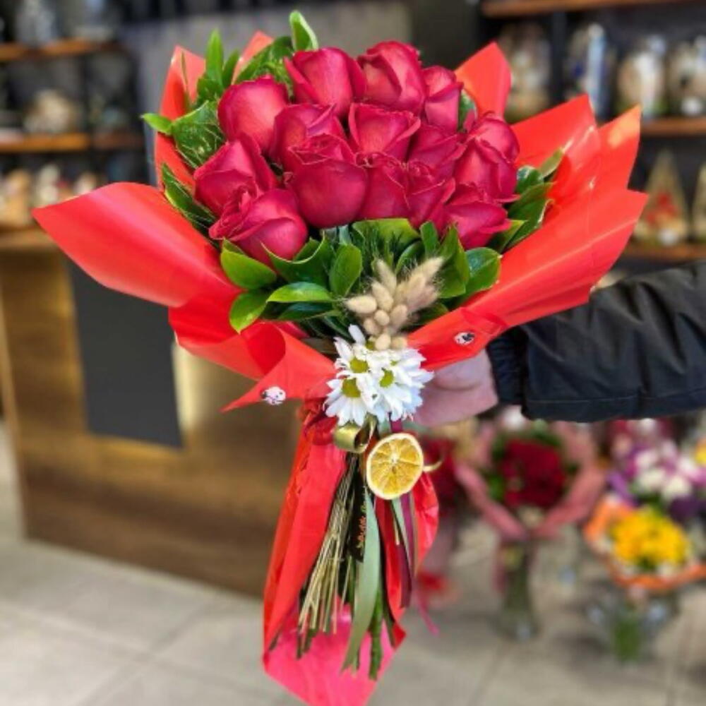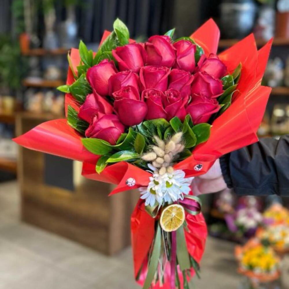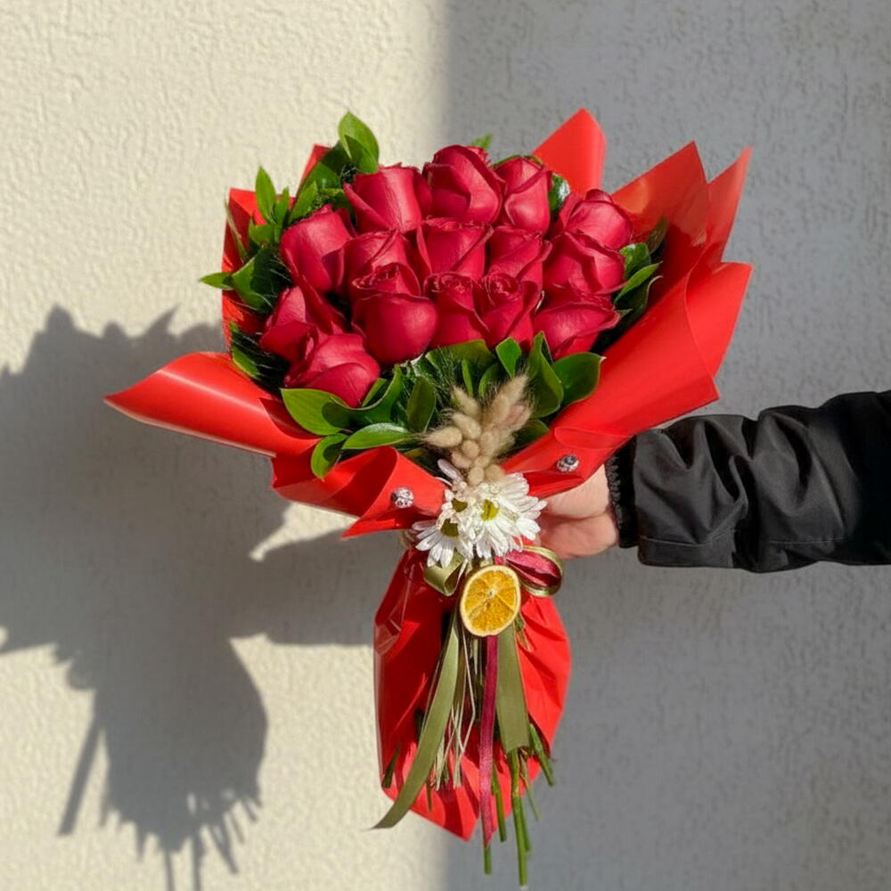 kırmızı gül - 15 adet yeşillik - 10 adet