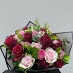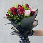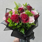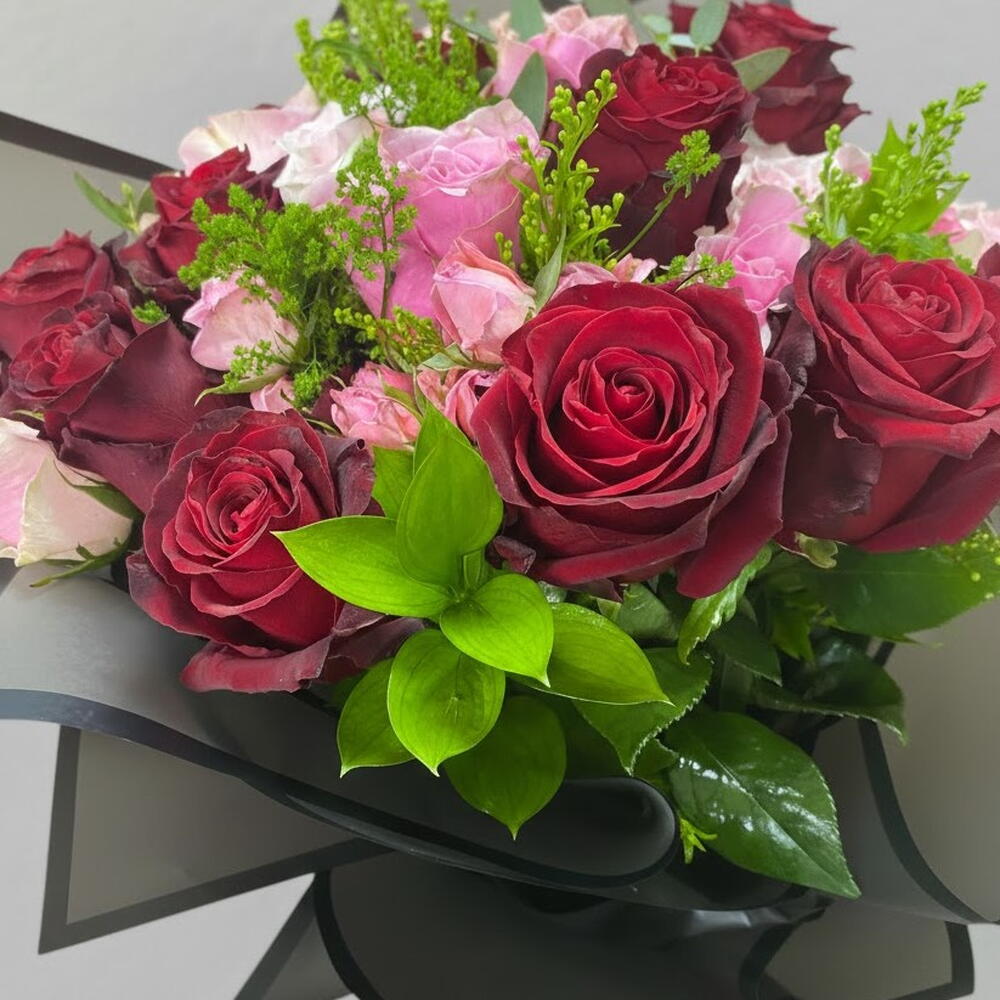 Kırmızı ve pembe güllerin büyüleyici uyumuyla hazırlanan bu zarif buket, romantizmin en etkileyici ifadesidir. Kadifemsi kırmızı güller tutkulu duyguları simgelerken, pastel pembe güller aranjmana yumuşak ve naif bir dokunuş katar. Canlı yeşillikler ve zarif dolgu bitkileri, bukete hacim ve doğal bir tazelik kazandırır. Modern siyah ambalajı sayesinde şık ve sofistike bir sunum sağlayarak ilk bakışta hayranlık uyandırır. Sevgililer Günü, yıldönümleri, doğum günleri, özür dileme jestleri ve romantik sürprizler için kusursuz bir tercihtir. Buketin ömrünü uzatmak için temiz su dolu bir vazoya yerleştirilmesi, suyun 2 günde bir değiştirilmesi ve sapların hafif çapraz kesilmesi önerilir. Doğrudan güneş ışığından ve cereyandan uzak tutulduğunda uzun süre tazeliğini ve canlı renklerini korur.