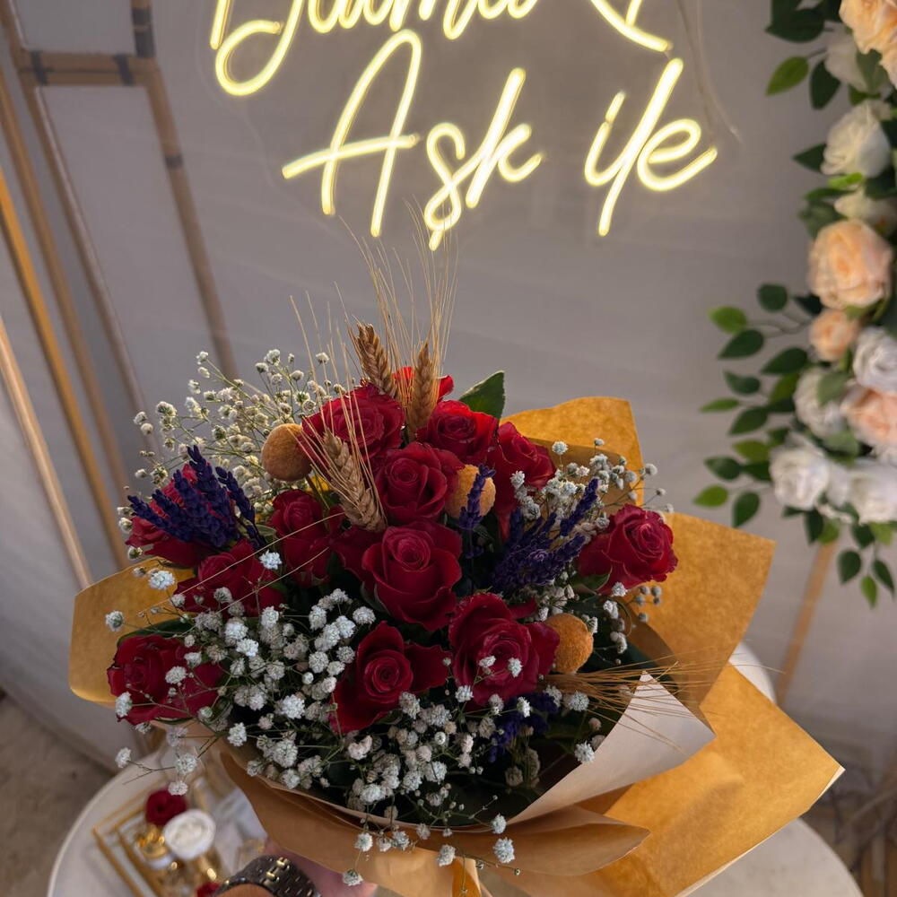 Bu şık çiçek buketi, romantik durumlar için ideal bir seçimdir. 15 adet parlak kırmızı gül ile hazırlanmış bu muhteşem buket, 5 adet cipso ve 3 adet lavanta ile süslenmiştir. Tüm bu öğeler, 3 adet dekoratif yeşillik ile tamamlanarak estetik bir görünüm kazanır. Bu çiçek buketi, sevdiklerinize ne kadar özeldiklerini göstermenin en zarif yoludur.