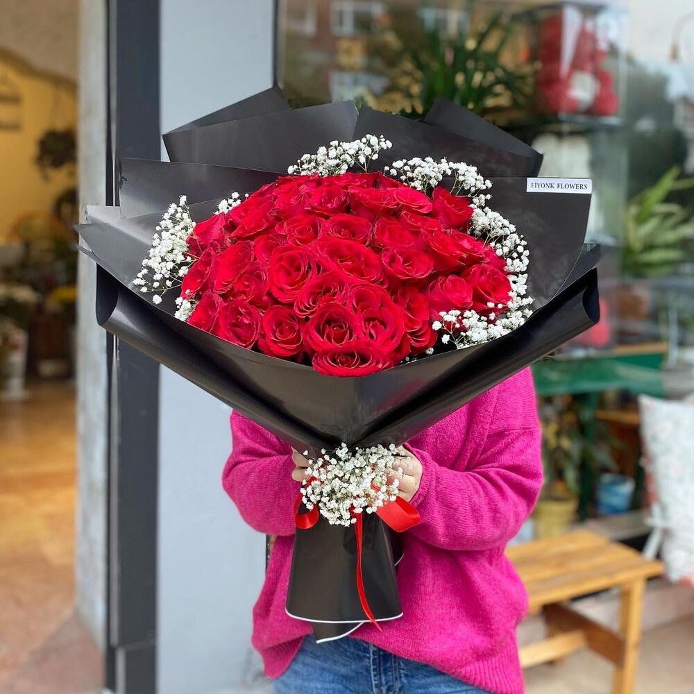 Bu büyüleyici mono buket, romantizm ve aşkın simgesi olan 50 adet kırmızı gülden oluşmaktadır. Her biri özenle seçilmiş ve mükemmel bir demet oluşturmak için ustaca birleştirilmiştir. Bu lüks buket, sevdiklerinize olan duygularınızı ifade etmenin en güzel yoludur. Güzelliği ve çarpıcı kırmızı tonları ile bu güller, gönülleri fethetmeye ve uzun süre kalıcı bir iz bırakmaya hazır.