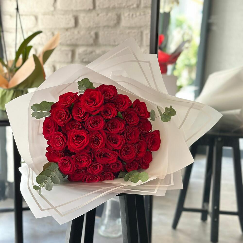 This Rose Mono Bouquet has been carefully prepared to accompany you in your special moments. This bouquet is perfectly designed with a stylish ribbon, 5 fresh eucalyptus, an elegant white silky bouquet paper and 33 Burgundy roses. These impressive flowers will add natural light to any room and transform the atmosphere dramatically. With its unique beauty, this rose bouquet will give you the courage to express your feelings. Этот монобукет роз был тщательно подготовлен, чтобы сопровождать вас в ваши особенные моменты. Этот букет идеально оформлен стильной лентой, 5 свежими эвкалиптами, одним элегантным букетом из белой шелковой бумаги и 33 бургундскими розами. Эти впечатляющие цветы добавят естественного света в любую комнату и кардинально преобразят атмосферу. Благодаря своей неповторимой красоте этот букет роз придаст вам смелости выразить свои чувства.