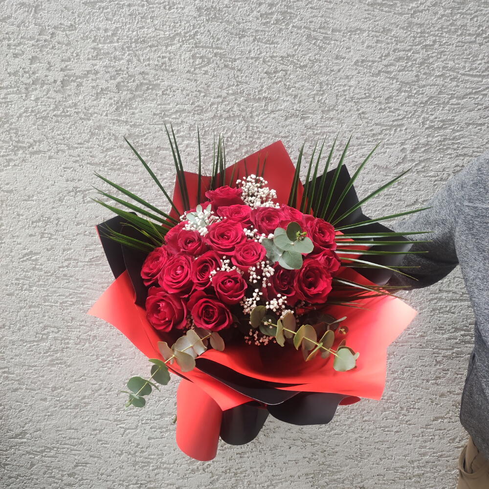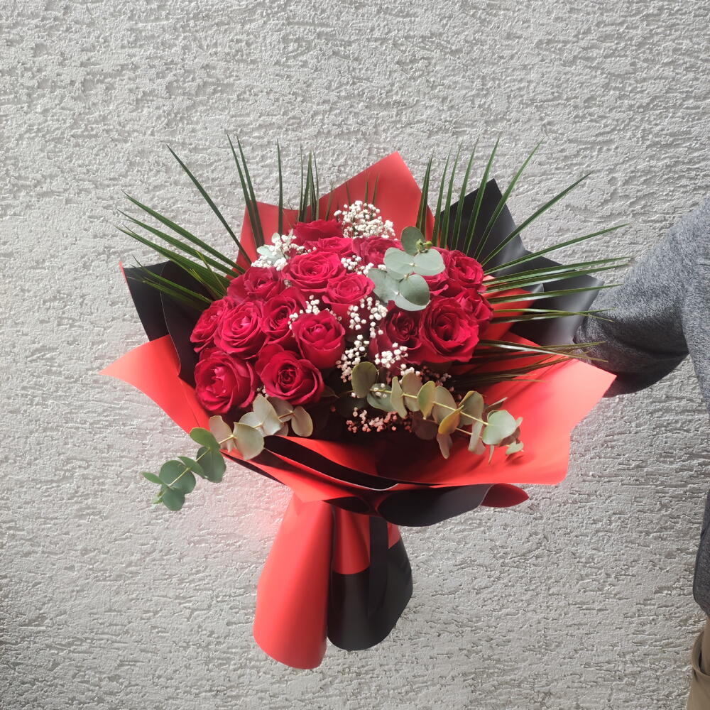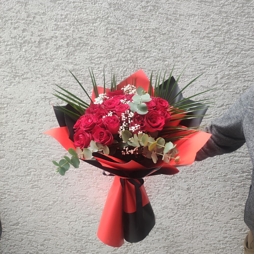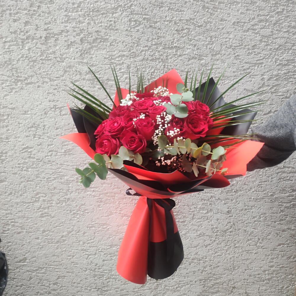 okaliptüs - 3 adet kırmızı gül - 20 adet fenix yaprak - 1 adet gibsofilya - 3 adet