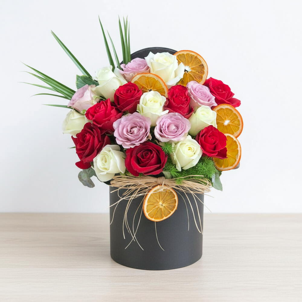 kırmızı gül - 7 adet beyaz gül - 5 adet okaliptus - 3 adet siyah kutu - 1 adet lila gül - 5 adet portakal - 4 adet