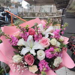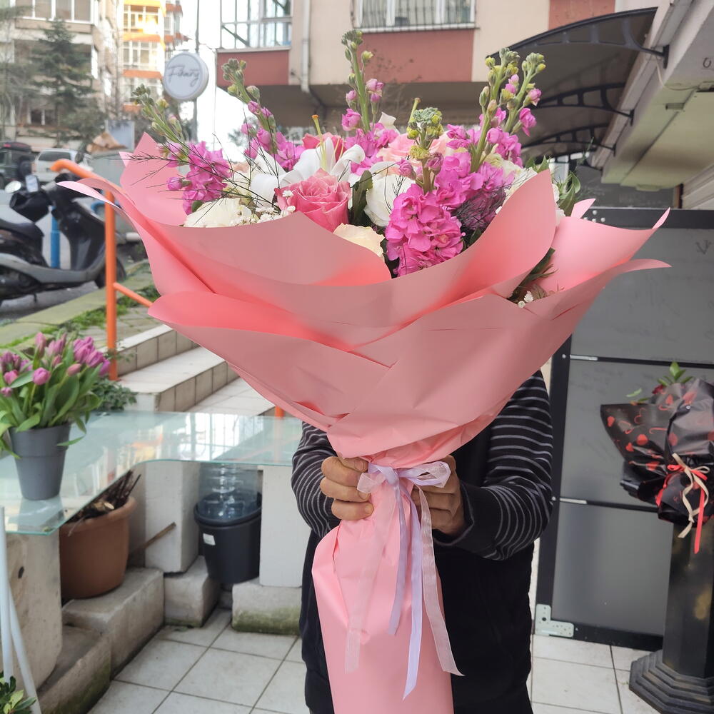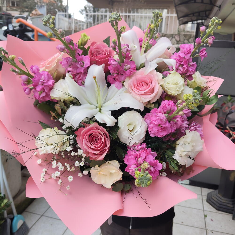 kurdele dantel - 2 adet lilyum kandili - 2 adet renkli güller - 5 adet lisyantus beyaz - 4 adet şebboy pembe - 5 adet dekoratif kağıt - 3 adet
