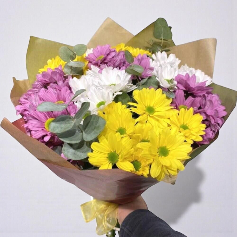 Bu göz alıcı buket, pembe, beyaz ve sarı papatyaların muhteşem uyumunu ve doğanın renk paletindeki zenginliği sergiliyor. Papatyaların her bir rengi, farklı duyguları ve anlamları temsil ederken, bir araya geldiklerinde ise bir uyum ve zarafet şöleni oluşturur. Pembe papatyalar neşe ve sevinci, beyaz papatyalar saflığı ve dinginliği, sarı papatyalar ise güneşin ışıltısını ve umudu simgeler. Bu buket, her bir papatyanın benzersiz güzelliğini ve ifadesini sunarken aynı zamanda görsel bir şölen sunar. Renklerin uyumuyla oluşturulan bu buket, özel günlerde veya günlük yaşamınızda sevdiklerinize mutluluk ve neşe getirmenin mükemmel bir yoludur. Pembe, beyaz ve sarı papatya buketi ile sevdiklerinizi büyüleyin ve onlara renkli ve anlamlı bir deneyim yaşatın.