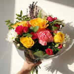 Renkli Gül ve Karanfil Buketi, göz alıcı sarı ve kırmızı güllerin zarif pembe karanfillerle birleştiği şık bir tasarımdır. Buketin içinde aynı zamanda beyaz papatyalar ve lavanta çiçekleri bulunur, bu da ona hem taze hem de şık bir hava katmaktadır. Sarı güllerin neşeli ve canlı rengi, pembe karanfillerin zarif dokunuşu ve lavantanın hoş kokusu, bu buketi özel kılar. Buket, özellikle özel günler için mükemmel bir hediye alternatifi sunar. Bu zarif aranjman, her ortamda sıcaklık ve renkli bir atmosfer yaratır. Sevdiklerinize olan duygularınızı ifade etmek için harika bir seçimdir. Bakım Önerileri: Çiçeklerinizin uzun süre taze kalabilmesi için, buketinizi doğrudan güneş ışığından uzak, serin bir ortamda tutmalısınız. Çiçeklerinizi düzenli olarak sulayın, ancak fazla su vermemek önemlidir. Saksıdaki su seviyesinin yeterli olduğundan ve suyun temizliğinden emin olun. Buketinizi doğru şekilde sulayarak uzun süre sağlıklı tutabilirsiniz.