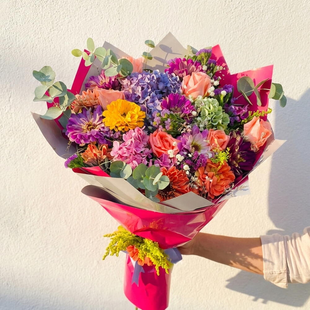 Bu canlı ve rengarenk buket, her özel anı unutulmaz kılmak için mükemmel bir seçenektir. 6 adet pembe gül, 5 adet sarı papatya ve 7 adet mor çiçek, bu buketi eşsiz ve dikkat çekici kılıyor. Buketin etrafındaki eucalyptus dalları ve yeşil buket kağıdı, ona doğallık ve şıklık katıyor. Buket, estetik bir görsellik sunarak hem iç mekan dekorasyonu hem de hediye olarak harika bir seçimdir. Bakım Önerileri: Bu buketi uzun süre taze tutmak için, doğrudan güneş ışığından uzak bir yerde saklamak önemlidir. Buketinizin suyu düzenli olarak değiştirilmelidir. Her 2-3 günde bir suyun değiştirilmesi ve buketinize taze su eklenmesi, çiçeklerin daha uzun süre canlı kalmasını sağlar. Aynı zamanda buketinizi serin bir ortamda tutmak, ömrünü uzatacaktır.