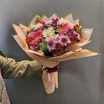 beyaz papatyalar - 10 adet pembe krizantem - 7 adet okaliptüs yaprakları - 3 adet turuncu mini krizantem - 7 adet mor statice çiçekleri - 5 adet