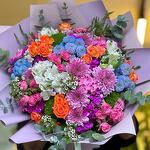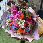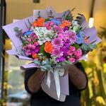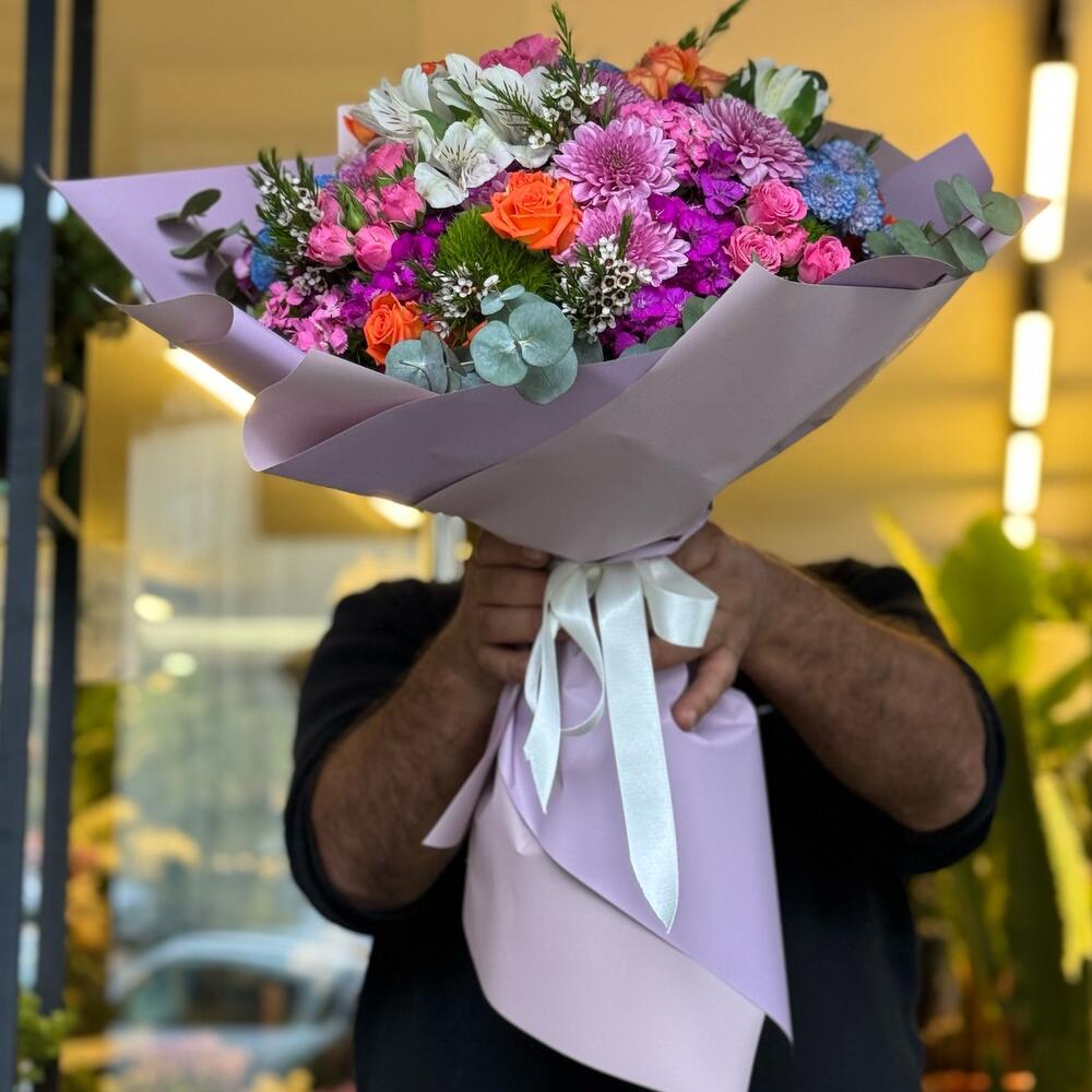 Renkli ambalaj kağıtlarıyla süslediğimiz gösterişli kır çiçekleri buketinde doğal sevginin sembolü orange ve pembe güllere crysantem çiçekleri, mavi,Fuşya ve pembe renkleriyle canlılık kattı,