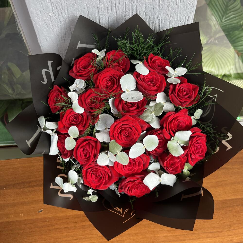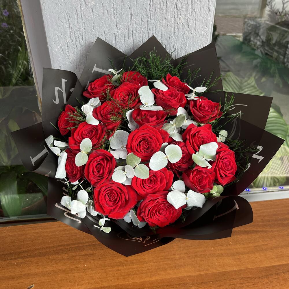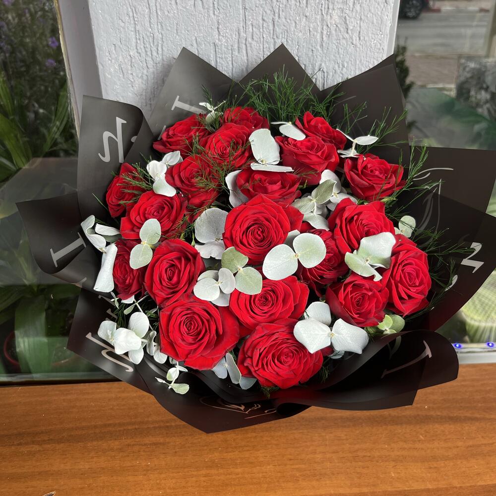 kırmızı gül - 21 adet buket kâğıdı - 4 adet okiliptus beyaz - 10 adet