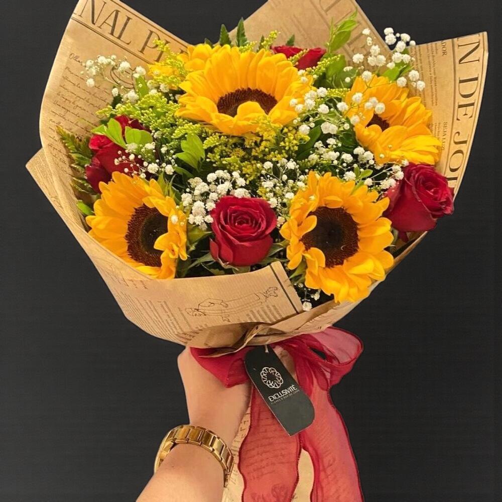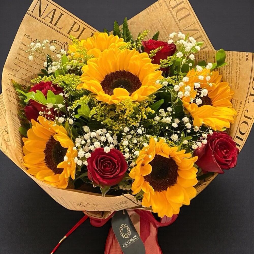 kırmızı gül - 4 adet ayçiçeği - 5 adet