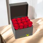 Bu ürün, 17.5 x 17.5 cm boyutunda siyah bir kare kutuda sunulan 12 adet kırmızı gülün zarif bir düzenlemesinden oluşmaktadır. Her biri özenle seçilmiş ve bütünlüğü tamamlamak için şık bir kutuya yerleştirilmiş olan bu gül demeti, sevdiklerinizin yüzünde bir gülümseme yaratmak için mükemmel bir seçimdir. İster özel bir günü kutluyor, ister sadece sevginizi göstermek istiyor olun, bu çiçek buketi her zaman mükemmel bir hediye olacaktır.