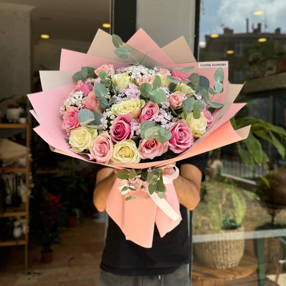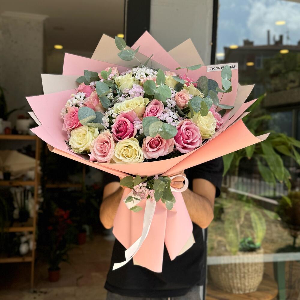 Bu özel tasarım ürün; özenle seçilmiş 10 adet okaliptüs, romantizmin simgesi 10 adet beyaz gül, zarif ve hassas 10 adet hüsnüyusuf çiçeği ve cazibeli 25 adet pembe güllerle özgün bir kompozisyon oluşturur. Her bir detayın özenle işlendiği bu özel tasarım çiçek aranjmanı, sevdiklerinize duygularınızı en güzel şekilde ifade etmenin en güzel yoludur. Hem şık, hem de anlamlı bir hediye arıyorsanız, bu aranjman tam size göre! Her bir çiçeği sevgiyle özenle seçilmiş ve elegant bir fusion yaratılmıştır. Muhteşem bir görünüme sahip olan bu çiçekler, ruhunuza değecek adeta!