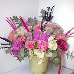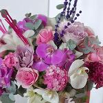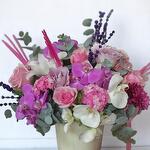 okaliptüs - 5 adet pembe gül - 5 adet lisyantus - 2 adet pembe ortanca - 2 adet lila gül - 3 adet mor orkide - 2 adet pembe krizantem - 1 adet beyaz orkide (phalaenopsis) - 4 adet kurutulmuş lavanta ve dekoratif dallar - 8 adet