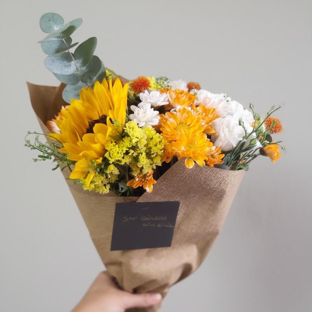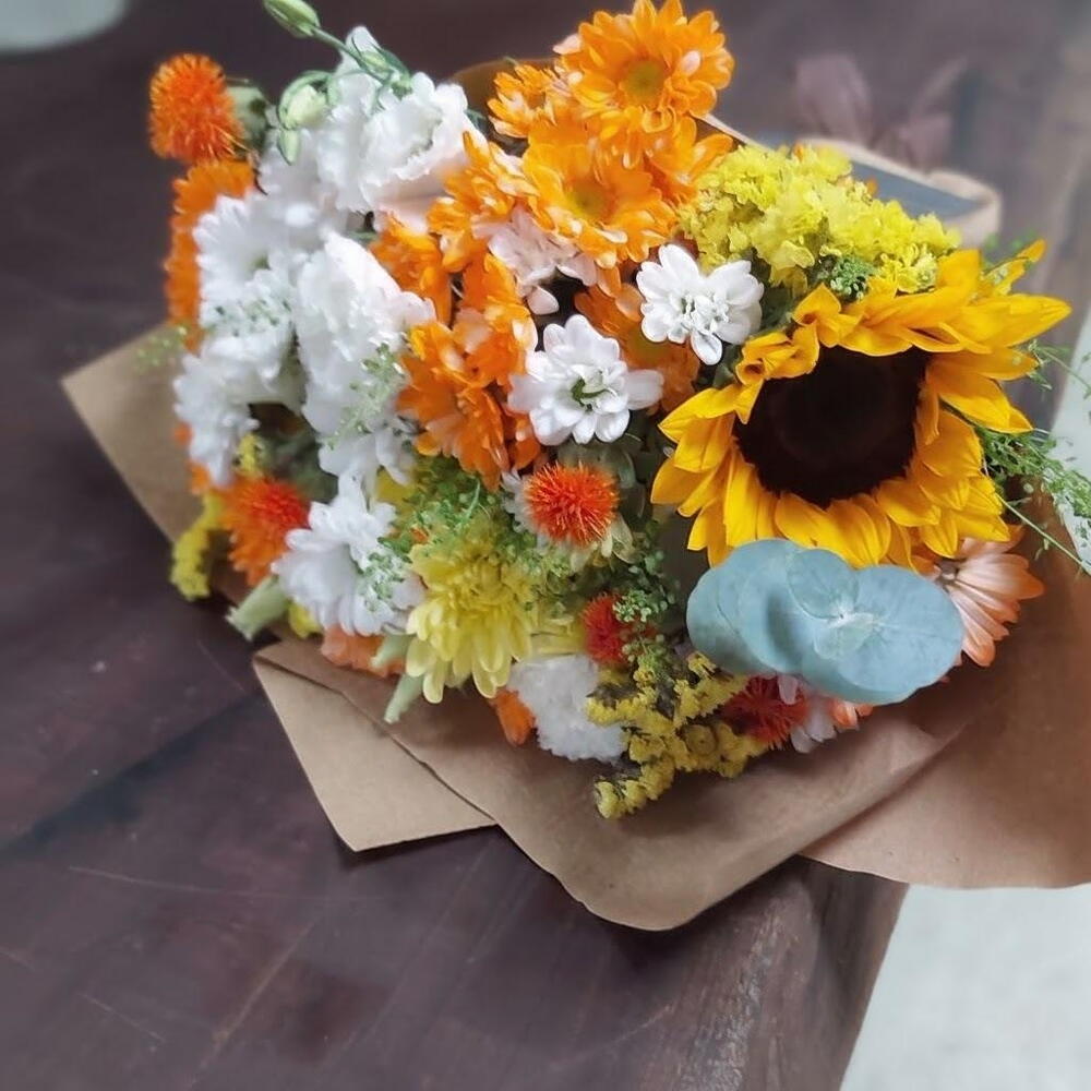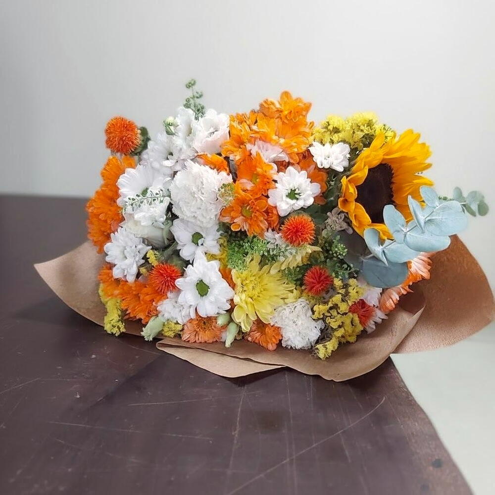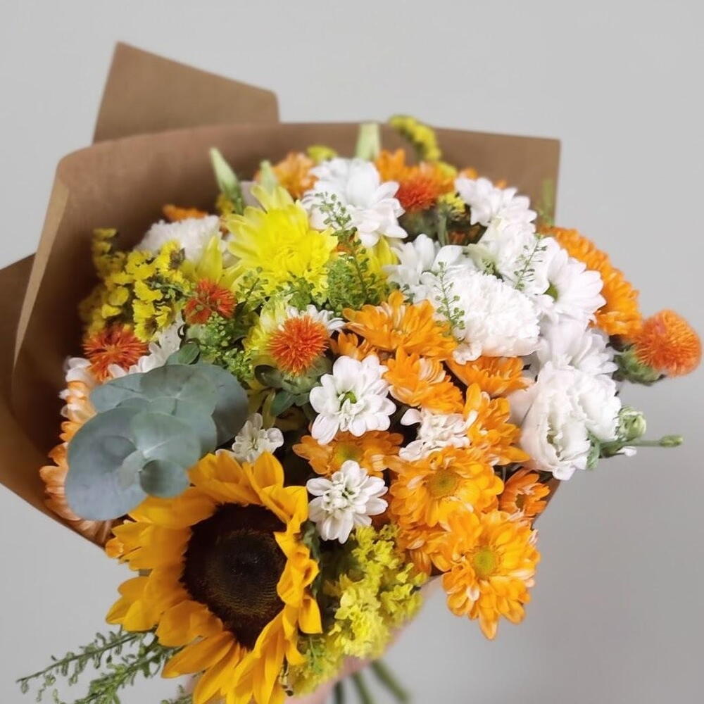 okaliptüs - 1 adet ayçiçeği - 3 adet yeşillik - 10 adet krizantem karışık renkli - 10 adet