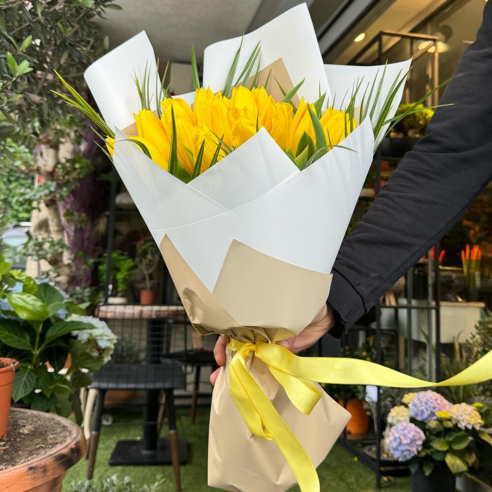 Kraft ve beyaz ambalaj kağıdıyla süslenen, rubbelini yapraklarıyla dekore edilen sıcak sevginin ifadesi sarı laleler, sade ve zarif buketiyle sevdiklerinize gönderilmeye hazır, İstanbul içinde 3 saatte çiçek teslimatları yaıyoruz.