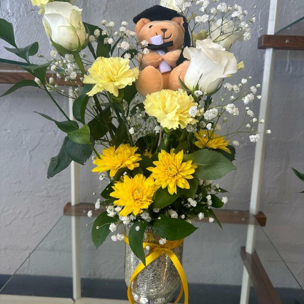 Bu olağanüstü Karışık Buket, 4 adet zarif beyaz gül, 3 adet canlı sarı gül, 3 adet cipsofilya ve 1 adet sevimli ayıcık ile süslenmiştir. Ayrıca, bu çarpıcı buketi tamamlamak için 5 adet sarı papatya eklenmiştir. İster bir sevdiklerinize hediye olarak, ister evinizi aydınlatmak için, bu buket her ortamda mükemmel bir kıvılcım ve romantizm katıyor.