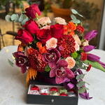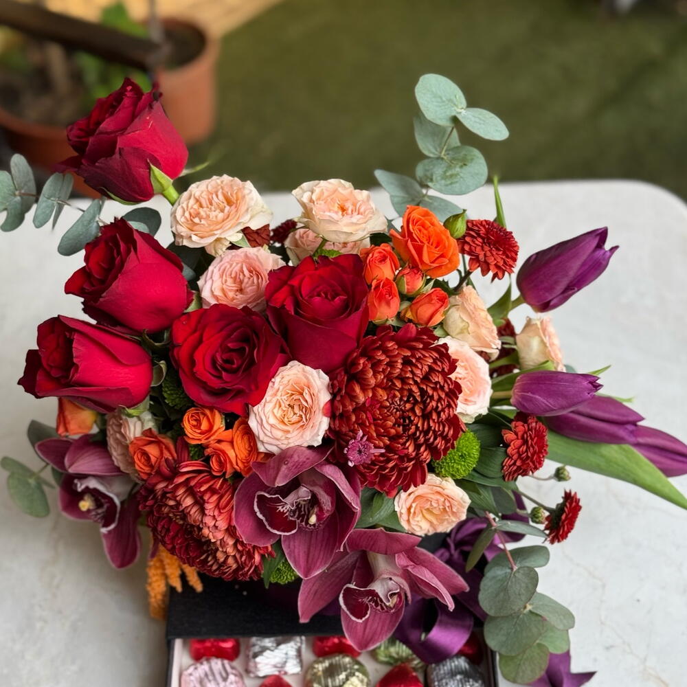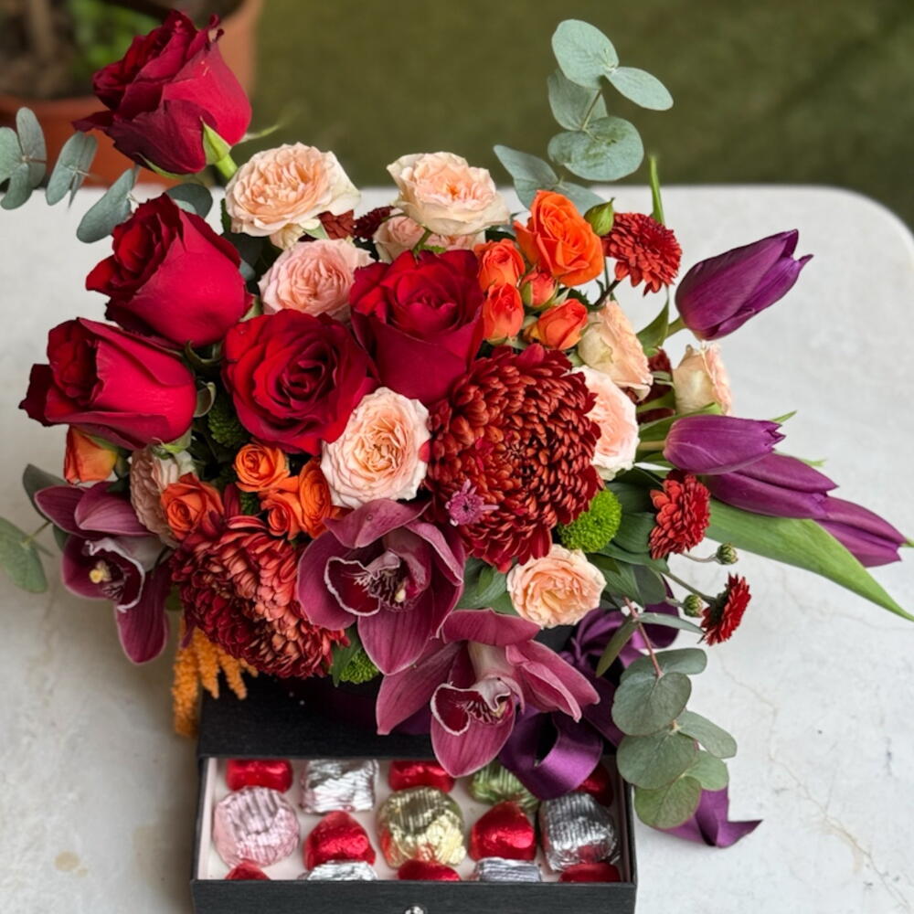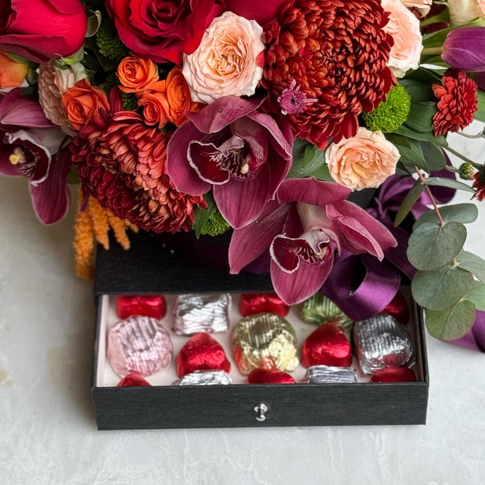 Kırmızı güllerin tutkulu enerjisi, orkidenin zarafeti ve anastasia çiçeklerinin hacimli şıklığı bu özel tasarımda buluşuyor. Alt kısmındaki çekmeceli kutuda yer alan kalp form çikolatalar sürprizi iki kat özel hale getirir. Romantik jestler, yıldönümleri, doğum günü sürprizleri veya unutulmaz bir “iyi ki varsın” demek için mükemmel bir seçim. Hem görsel olarak etkileyici hem de tatlı bir dokunuş sunan bu tasarım, duygularınızı en zarif şekilde ifade eder. Özenle hazırlanan aranjman; kırmızı güller, orkide, anastasia ve seçkin yeşilliklerle tasarlanmıştır. Çikolata çekmeceli özel kutusu ile birlikte gönderilir.