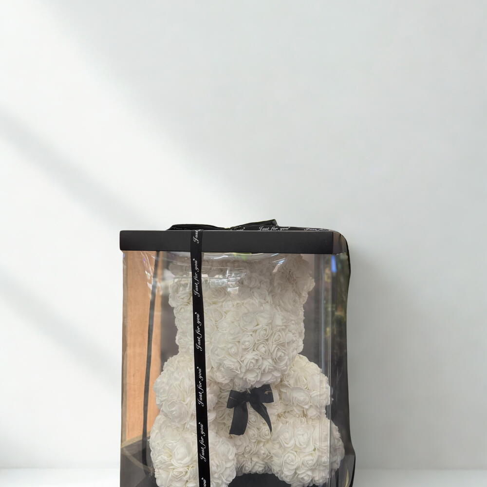 Şeffaf Kutuda Teddy Rose Beyaz Ayıcık (~45cm)