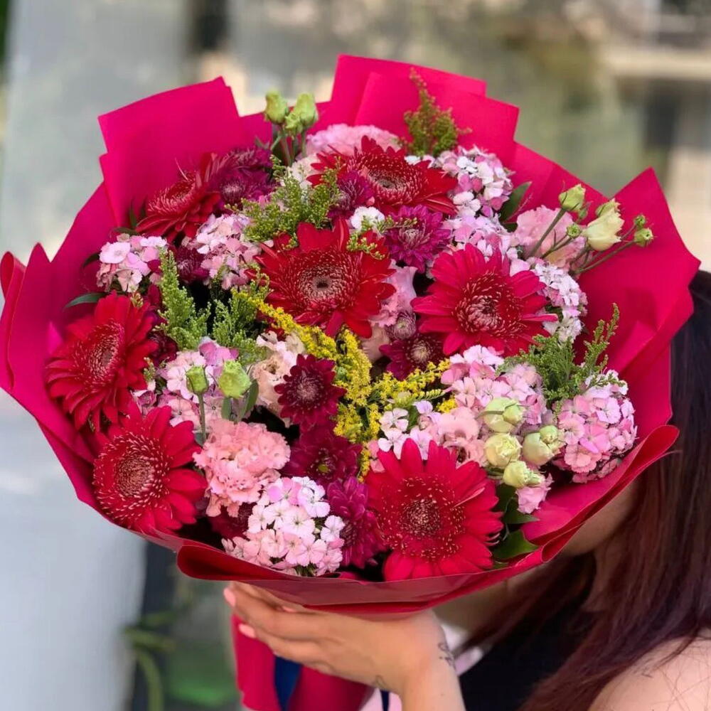 ambalaj - 2 adet soli - 5 adet kırmızı gerbera - 8 adet hüsnü yusuf - 8 adet pembe lisiyantus - 2 adet
