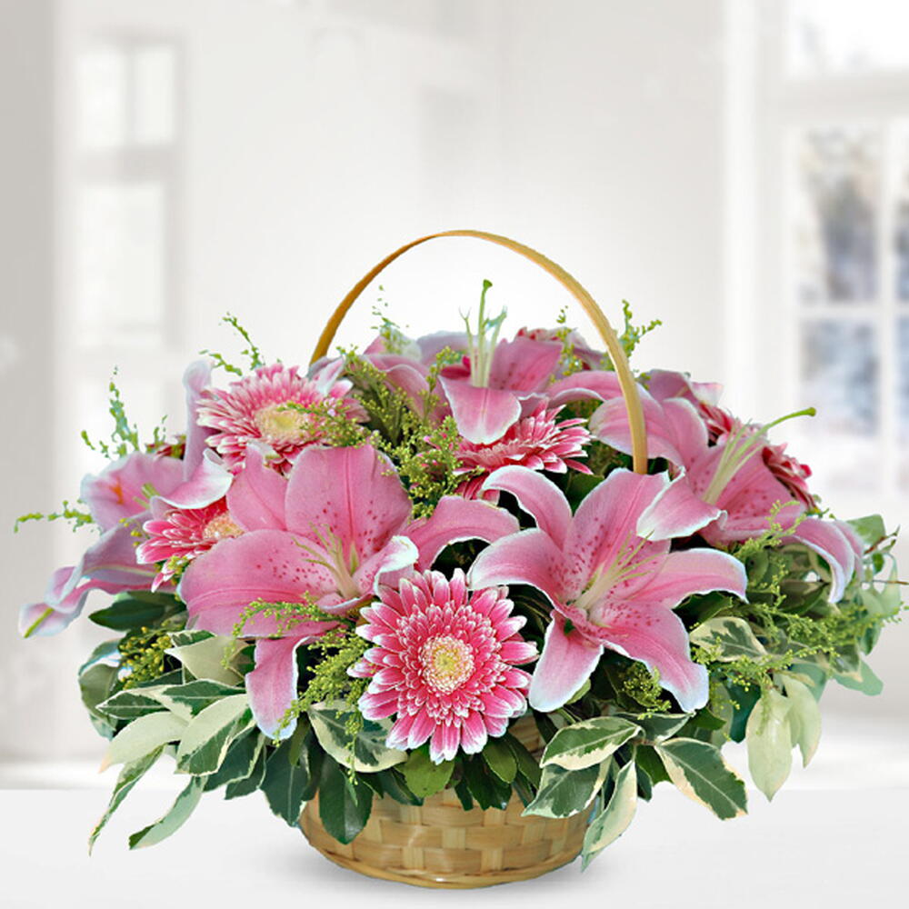 sepet - 1 adet pembe lilyum - 6 adet pembe gerbera - 6 adet yeşi̇lli̇kler - 5 adet