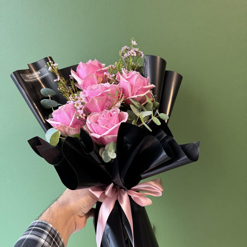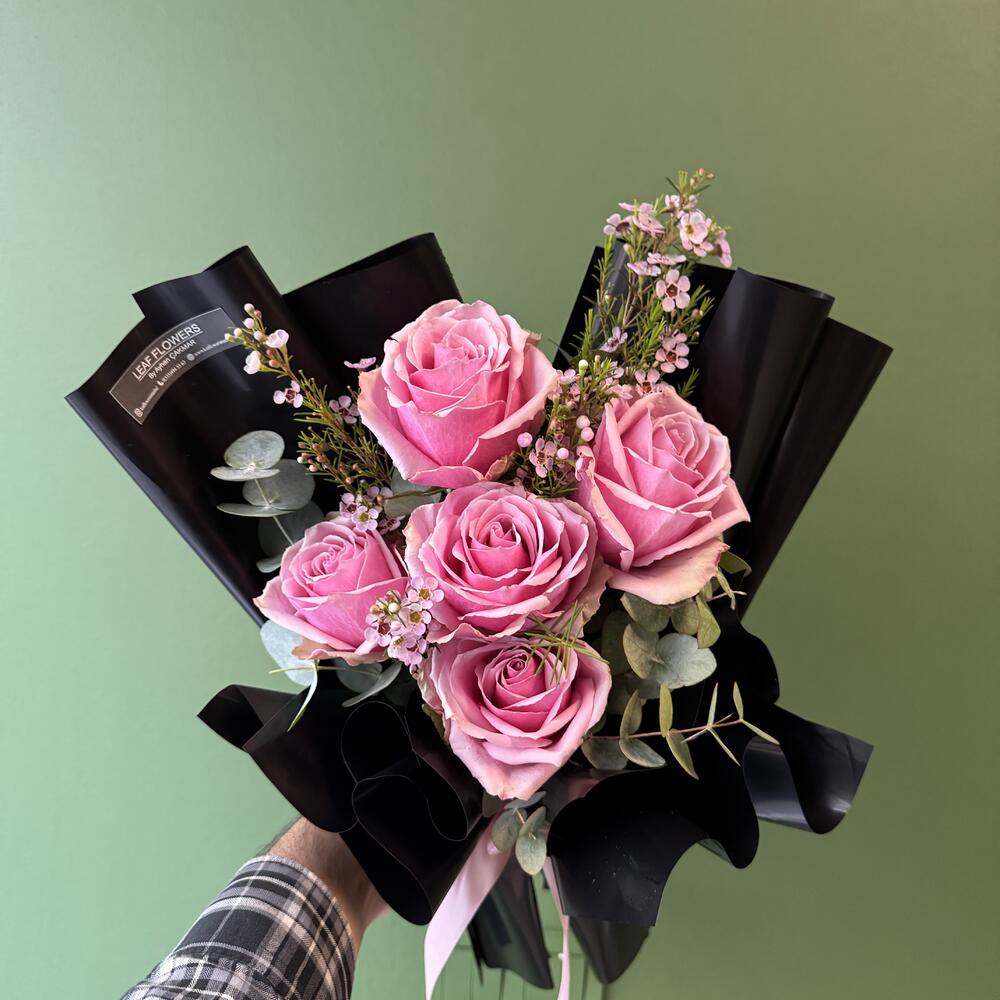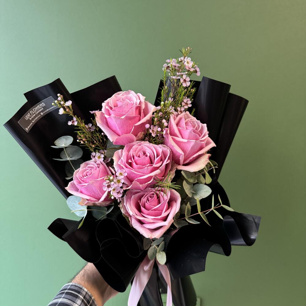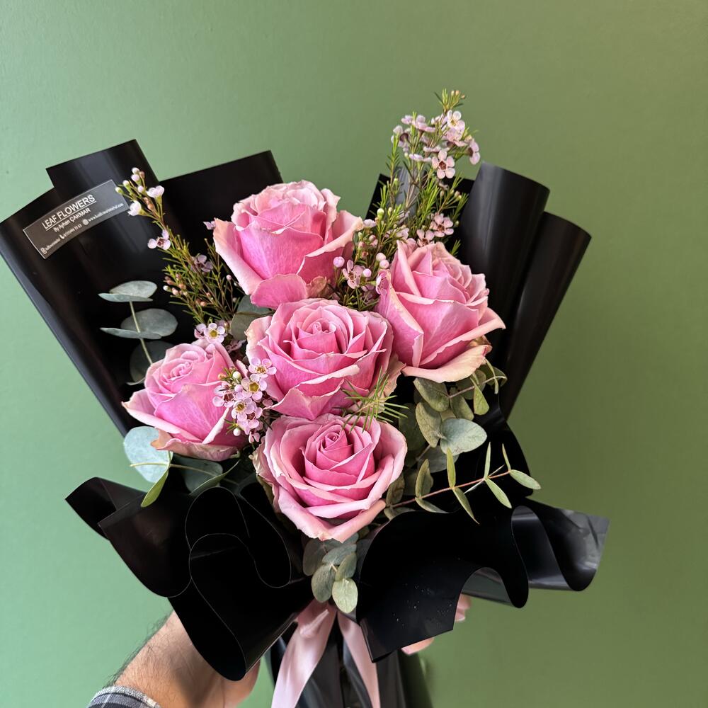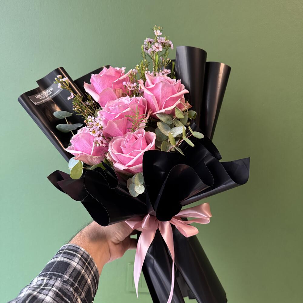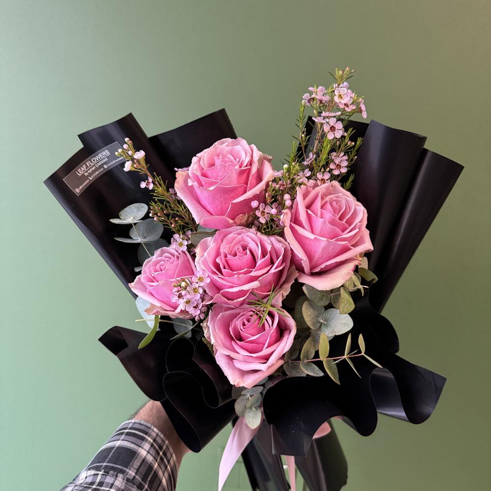 okaliptüs - 7 adet pembe gül - 5 adet vaks - 3 adet