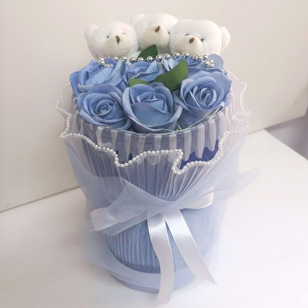 Zarif ve tatlı detayların buluştuğu bu mavi tonlu aranjman 💙🐻, hem huzur hem de neşe dolu bir hediye seçeneği sunuyor. Yumuşacık üç mini beyaz ayıcık, masmavi yapay güllerin arasında adeta bir masal sahnesi oluşturuyor. İnci detaylı tül sarmalaması ve beyaz saten kurdelesiyle şık ve romantik bir görünüm kazandırılmıştır. Yeni doğum, doğum günü veya özel kutlamalar için duygusal ve unutulmaz bir jesttir. Solmayan yapay çiçekleriyle uzun süre dekoratif güzelliğini korur. Çiçekler yapay olduğu için suya gerek yoktur. Tozlandığında yumuşak bir fırça veya kuru bezle nazikçe temizleyin. Güneş ışığından uzak, serin bir ortamda muhafaza edin.
