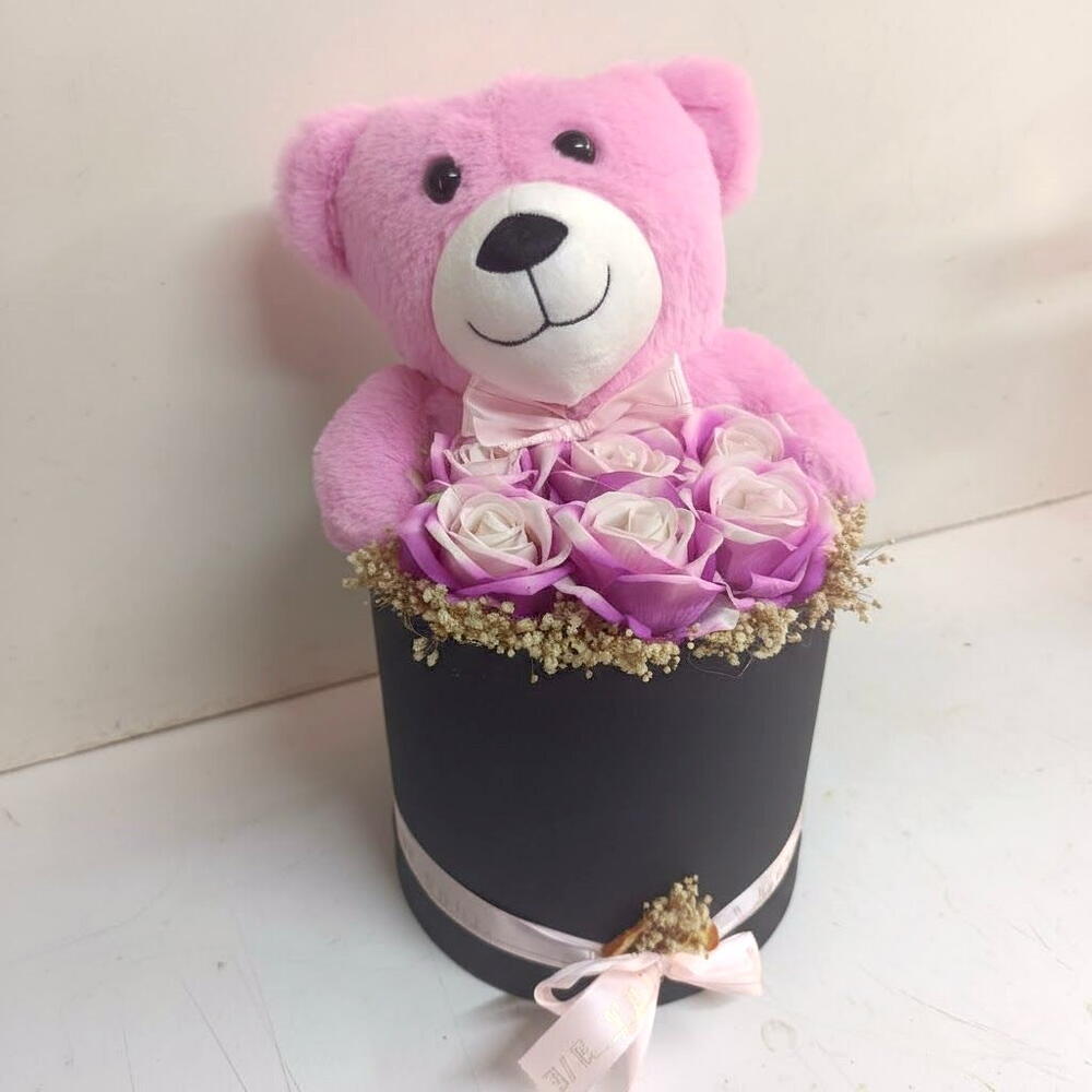 Silindir kutuda pembe ayı ve 6adet pembe yapay guller