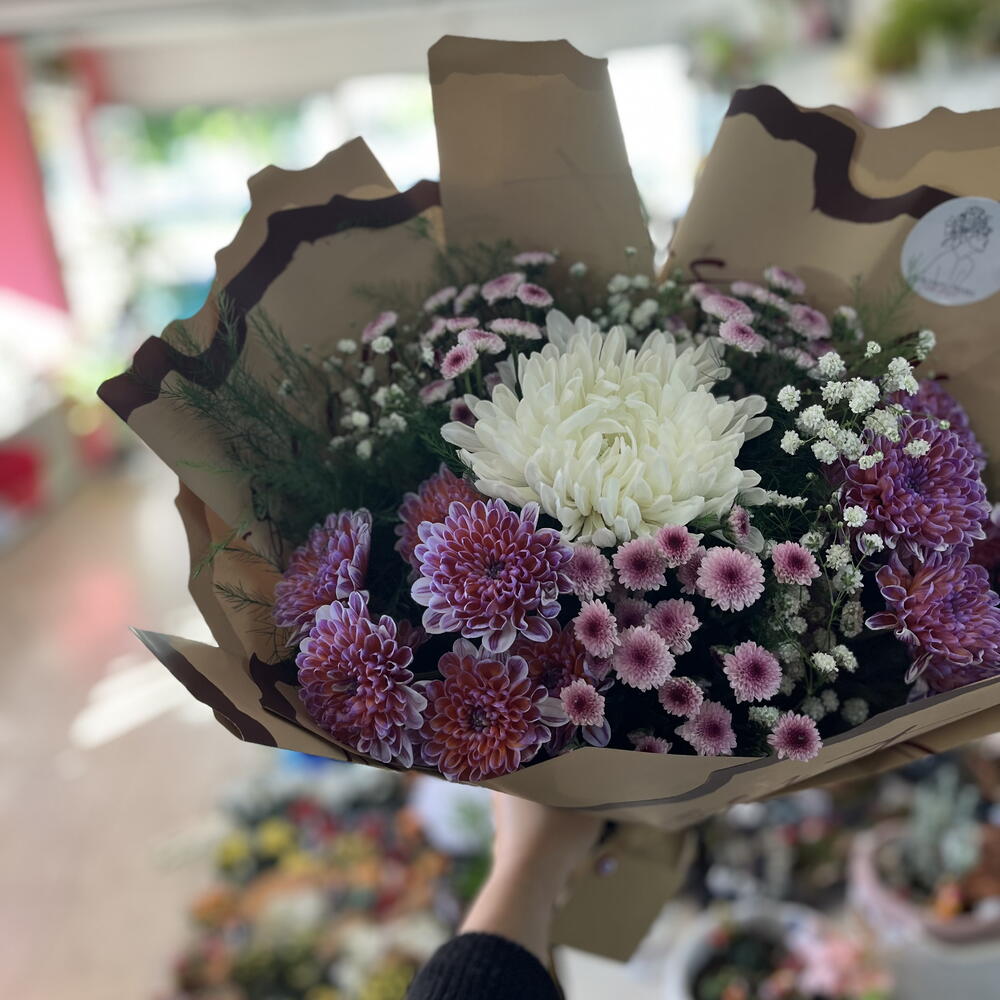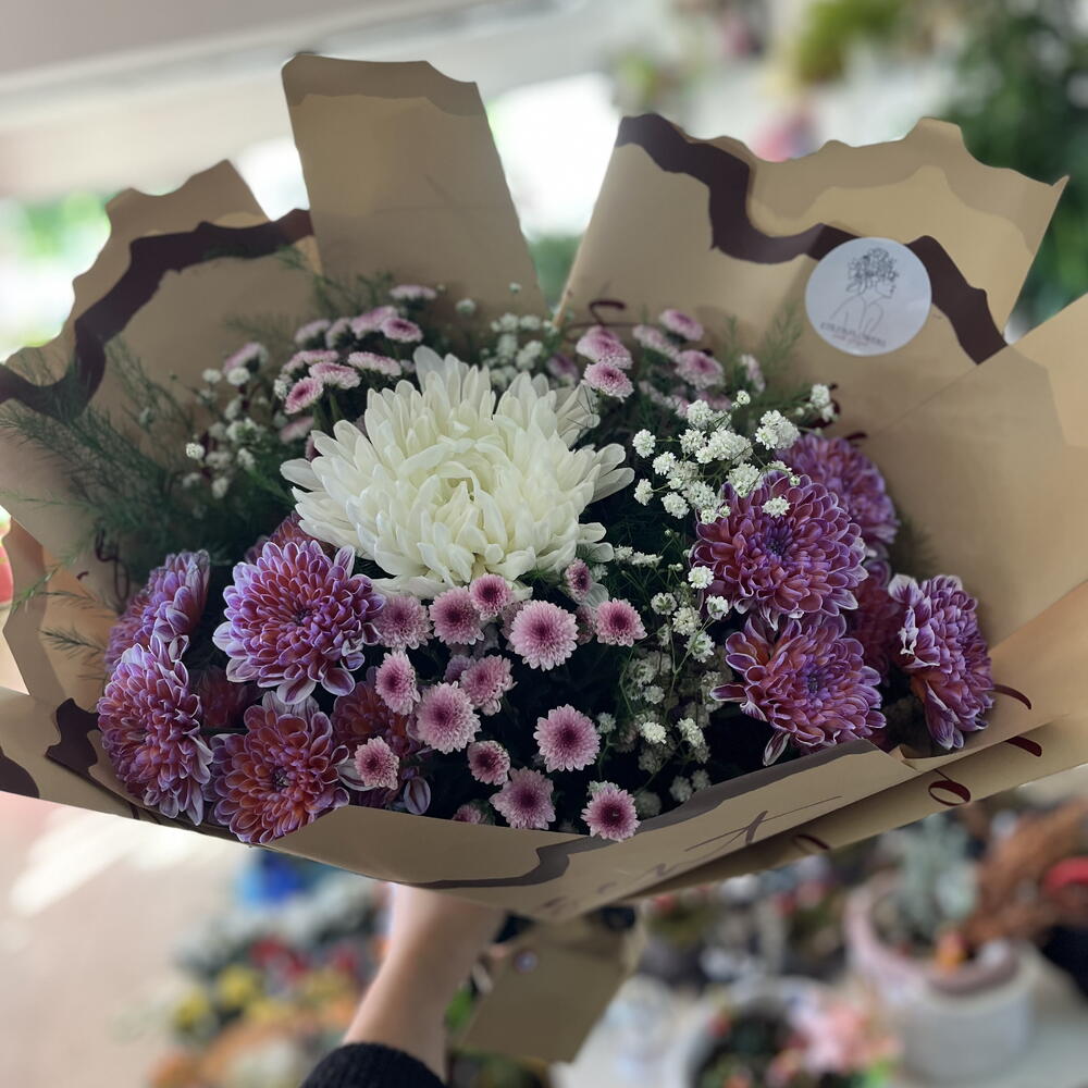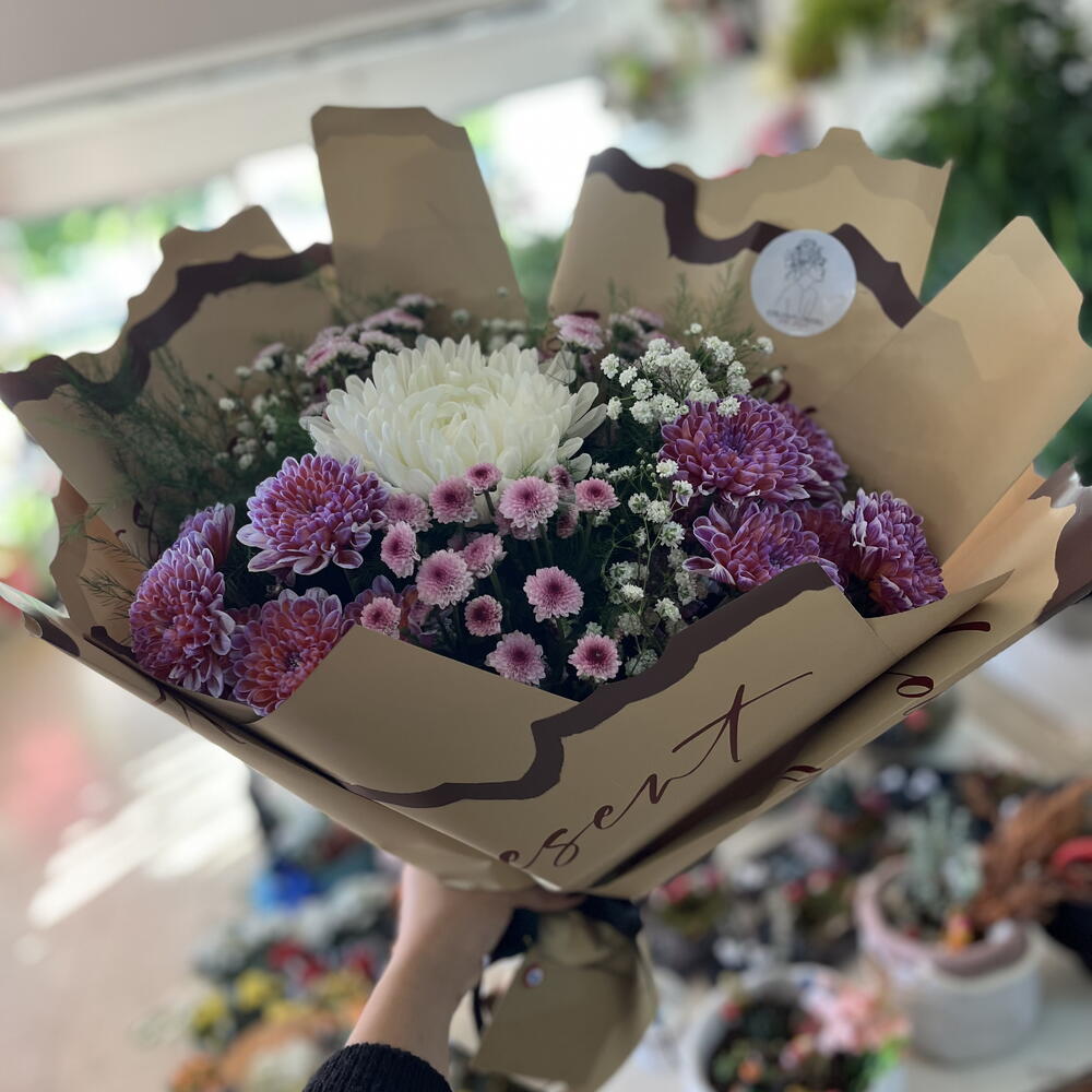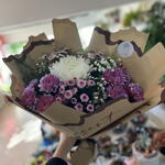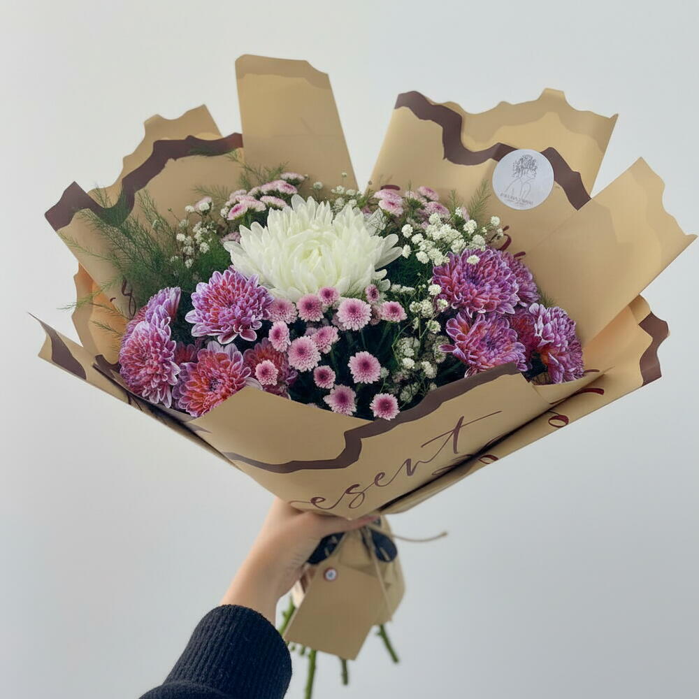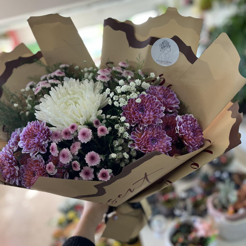 Bu zarif çiçek buketi, mor, pembe ve beyaz tonlarının büyüleyici uyumuyla göz kamaştırıyor. Yumuşak renk geçişleri, sadelik ve zarafeti bir araya getirerek huzur dolu bir atmosfer yaratıyor. Her bir çiçek özenle seçilmiş, taze ve canlı dokusuyla bukete doğal bir zarafet katıyor. Özel günlerde sevdiklerinize armağan etmek ya da yaşam alanınıza tazelik getirmek için mükemmel bir seçimdir. Kahverengi kâğıt ambalajı, modern ve sıcak bir dokunuş sağlar. Bu buket, sevgi, zarafet ve içtenliği en doğal haliyle yansıtır.