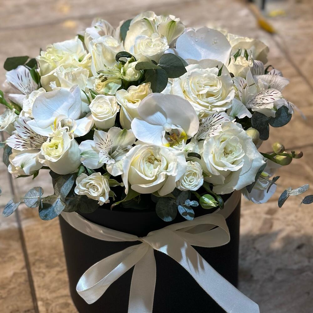 Bu zarif kutu arajma 10 adet taze beyaz gül, 10 adet parlak orkide kandili, 10 adet sprey beyaz gül ve 10 adet canlı astomeria ile dolup taşan siyah bir kutuda sunulmaktadır. Bu şık kompozisyonu tamamlamak için 5 dal okaliptüs kullanılmıştır. Bu buket, saflığın, şıklığın ve zarafetin bir sembolüdür. Beyaz güller ve orkideler, sevdiklerinize olan duygularınızı aktarmanın en güzel yolu olabilirken, göz alıcı astomeria, buketinize canlılık katabilir. Tüm bu güzellikler, şık bir siyah kutuda servis edilerek estetik bir görünüm sunar. Bu, özel birini etkilemek için mükemmel bir seçim olabilir.