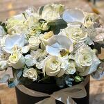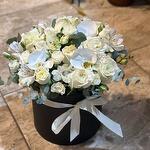 Siyah kutuda orkide ve beyaz guller