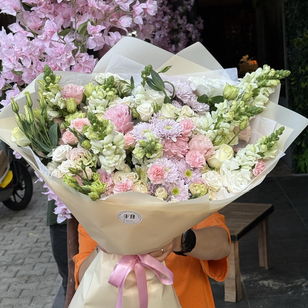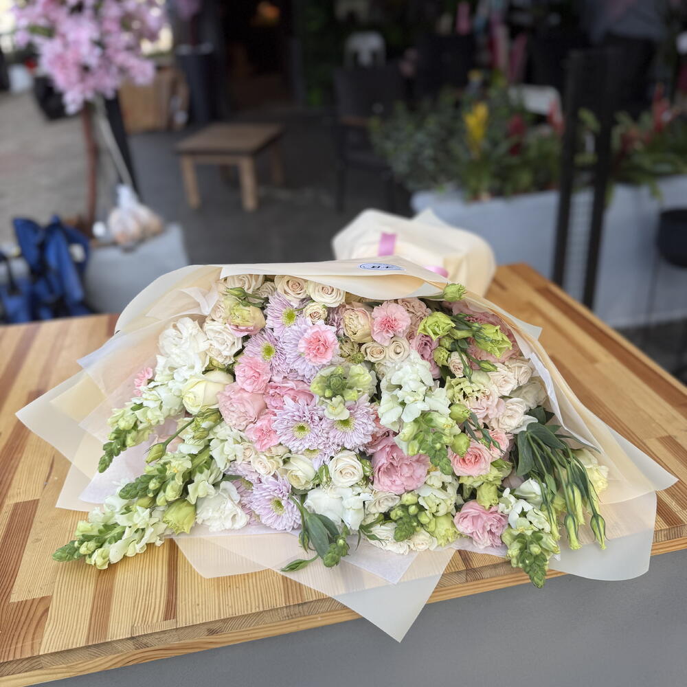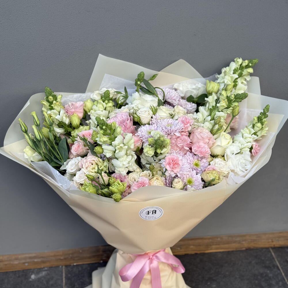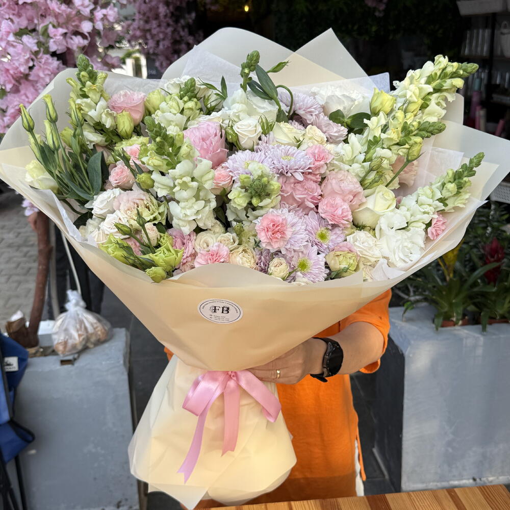 Bu büyüleyici çiçek buketi, ortamınıza tazelik ve zarafet katmak için mükemmel bir seçimdir. Zarif eustomalar, bembeyaz güller, renkli karanfiller, zarif krizantemler ve zarif şebboyların muhteşem birlikteliği ile bu buket, bilinen tüm çiçeklerin en güzel aharmanını sunuyor. Kustova gülleri ise eşsiz ve özel bir dokunuş ekler. Çiçeklerin dingin güzelliği, bu çiçek buketini özel günlerinizde sevdiklerinize hediye etmek için ideal kılar. Her bir çiçeği özenle seçilmiş bu muhteşem buket, çiçeklerin büyüleyici dünyasını sizinle buluşturacaktır.