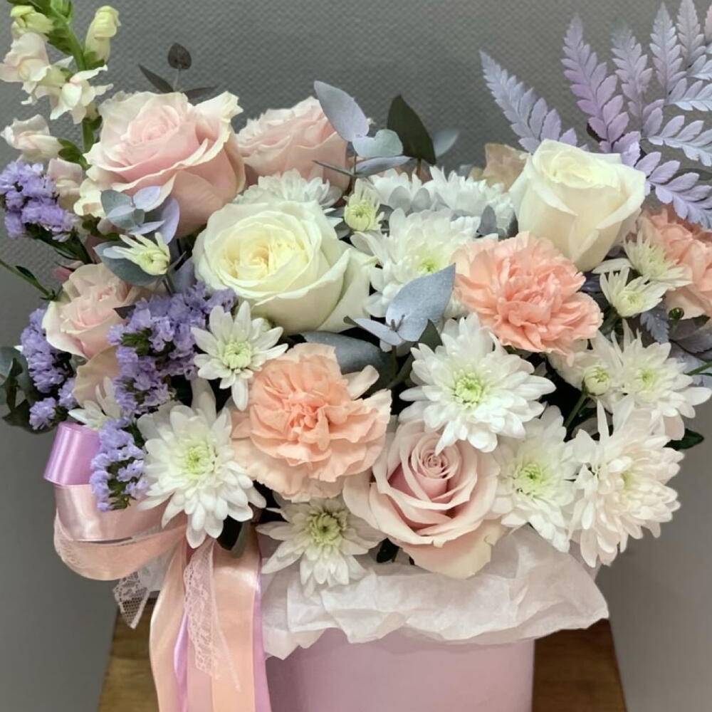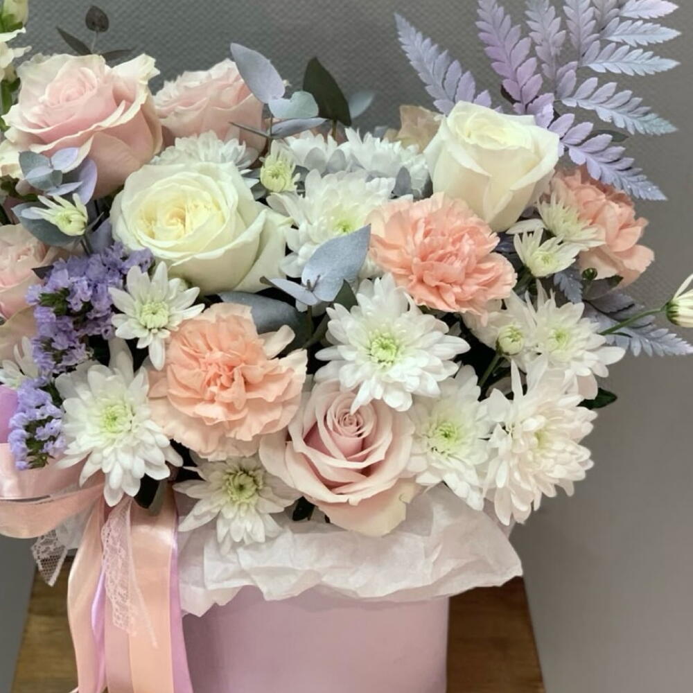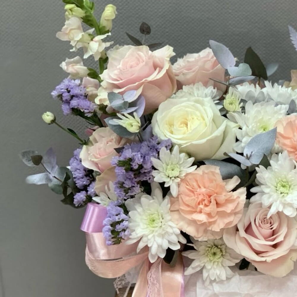La caja floral pastel de lujo es un arreglo sofisticado diseñado con rosas blancas importadas, rosas spray y delicadas flores en tonos suaves que transmiten elegancia, ternura y armonía. Presentada en una elegante caja decorativa, esta composición floral es ideal para cumpleaños, aniversarios, nacimientos, agradecimientos y regalos exclusivos. Su combinación de flores premium y follaje natural crea un diseño romántico y moderno que destaca en cualquier espacio, convirtiéndose en una opción perfecta para quienes buscan un regalo floral refinado y memorable.